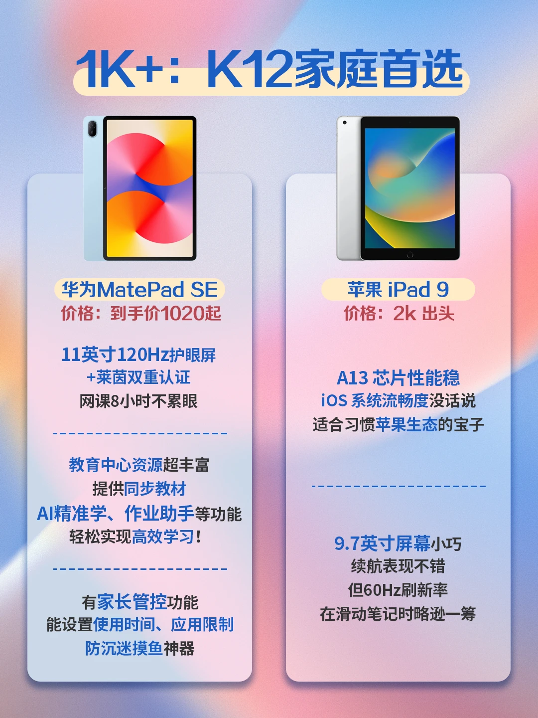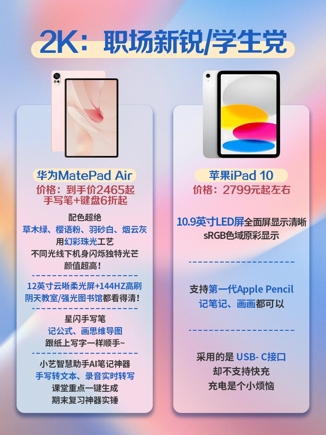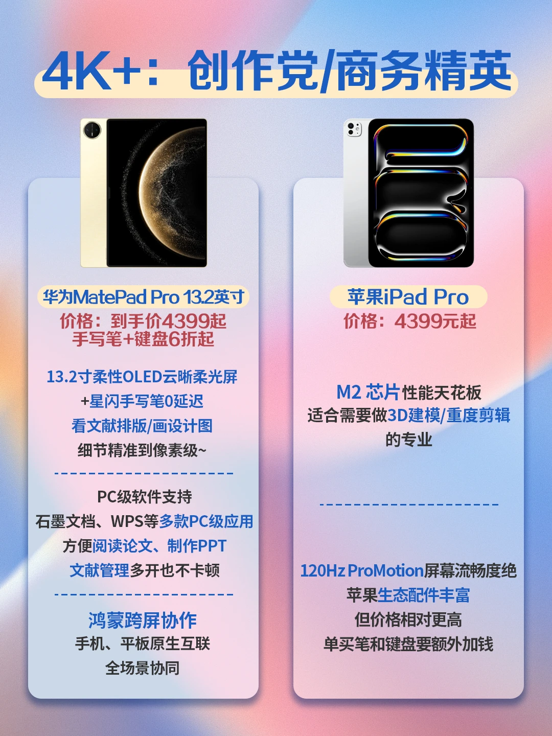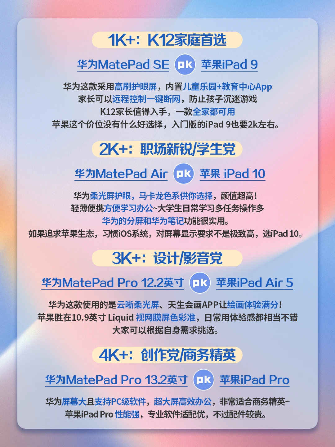 今天从刚需角度,对比一下华为和苹果4个价位平板1k-4k全覆盖,宝子们可以根据自己的预算,按需选择不踩雷!
