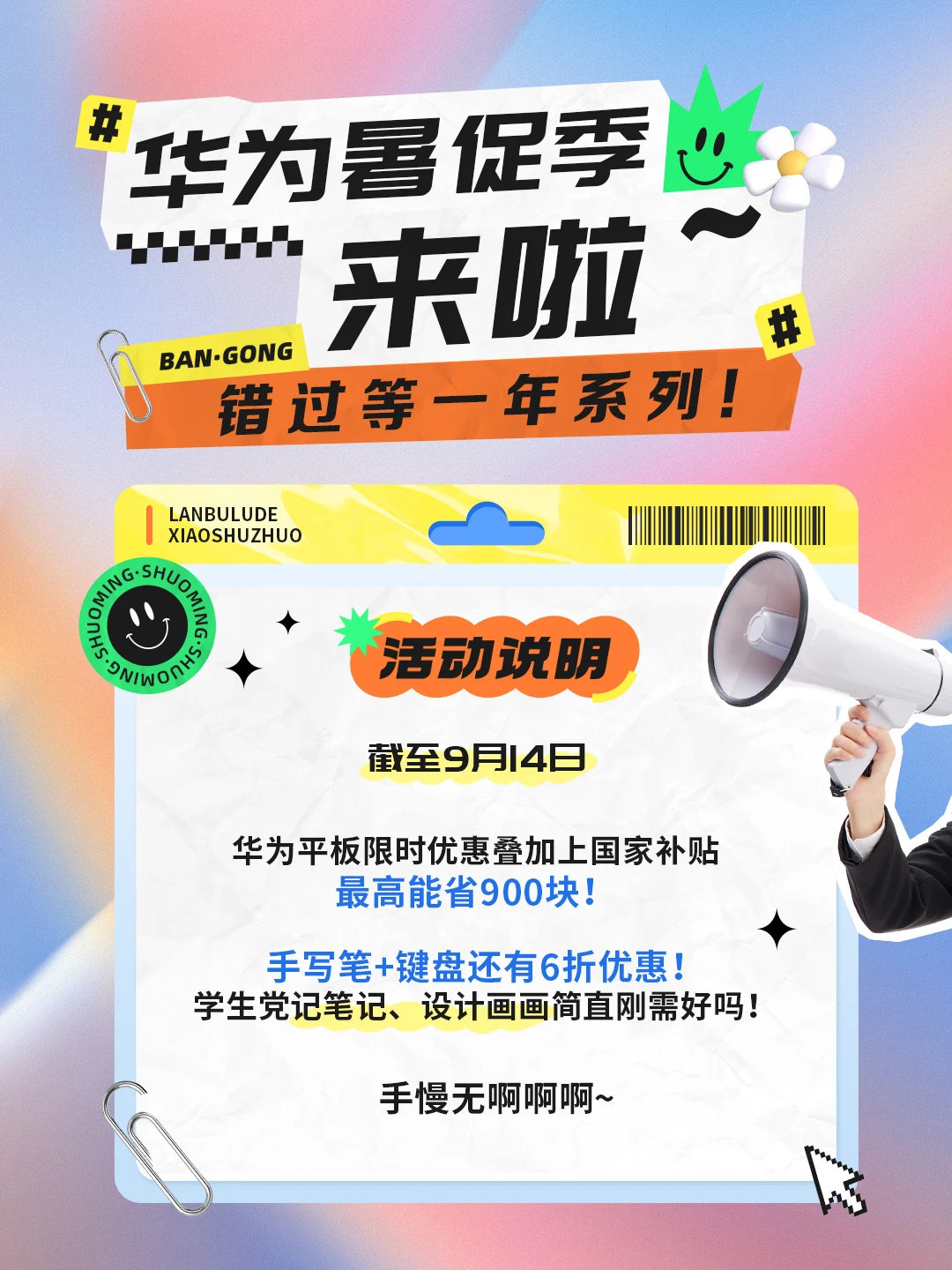 宝子们可以根据自己的需求和预算选择,现在正好是华为暑促季,截至9月14日,华为平板限时优惠叠加上国家补贴(至高优惠可达900),手写笔+键盘还有6折优惠,学生党记笔记、设计画画简直刚需!