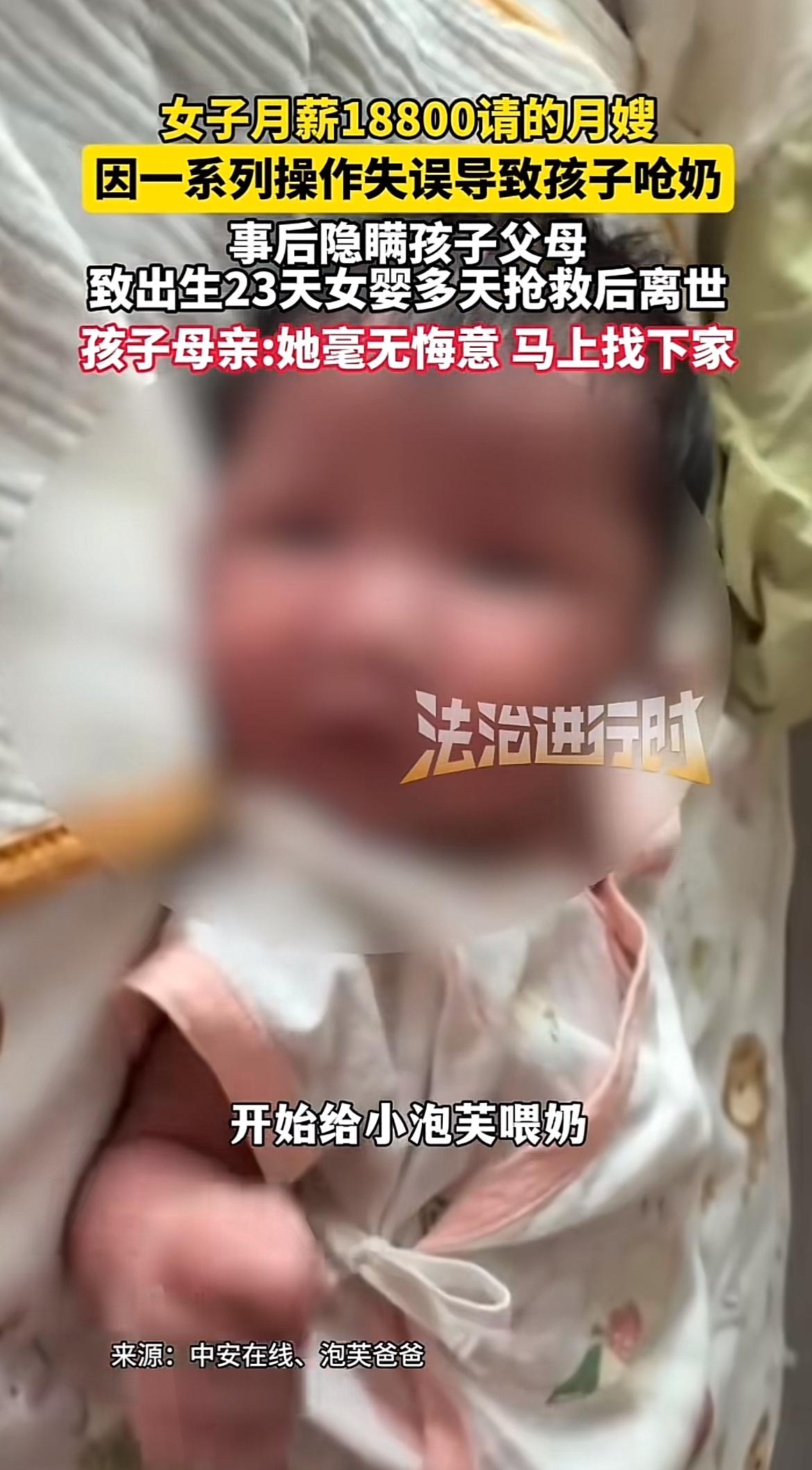 杭州这对新手爸妈花1万8请“高级月嫂”,结果却遭遇了悲剧。才23天大的女婴,因月嫂喂奶操作不当呛奶窒息,抢救9天后离世。 事发凌晨,月嫂在昏暗小夜灯下喂奶,宝宝1点56分开始呛咳,持续哭声长达26秒,月嫂却还说“来来来,再来哦”,直到1点58分才放下奶瓶。家属发现异常,月嫂还隐瞒情况,耽误了抢救。 更可气的是,孩子没了,月嫂竟淡定找新雇主,连道歉都没有。这让宝妈愤怒又绝望,家属情绪崩溃,宝妈也重度抑郁。请月嫂可得擦亮眼睛,这种“高级月嫂”谁敢请啊!