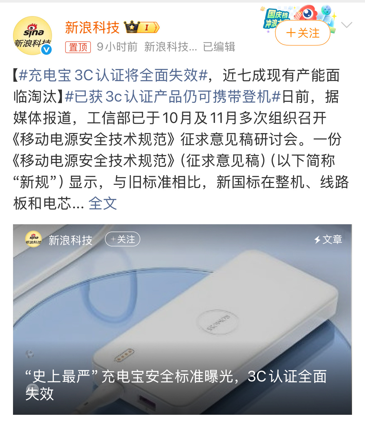 啊,我记得不久前才审核说充电宝必须有3c标志,当时因为总是要出差登机专门买了一个新的,这是又升级了吗,有3c 的也不行了?还有为什么充电宝涨价也上热搜了啊,这是要涨到什么惊人的价格了吗…😱不过之前充电宝频频出事,提高标准肯定是好事,也是为了大家的人身安全着想!