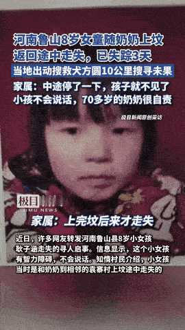 奇了怪了!河南一8岁小女孩和奶奶骑着电动车去上坟,不料回家途中短暂停了一会儿,小女孩就不见了。家属和救援队、民警在寻找了3天,小女孩就像人间蒸发一般,不见踪影!这名小女孩名叫耿子涵,是河南鲁山县人,今年8岁,她不是普通人,有智力缺陷,而且不会说话。小女孩的伯母说,2025年11月20日,子涵的奶奶骑着电动车,带她到隔壁的袁寨村上坟。下午4点左右,回家时奶奶和她又在袁寨村停留了一会儿。奶奶一个没注意,子涵就不知道跑哪里去了!发现孩子走丢了以后,民警和小女孩的家人还有蓝天救援队迅速展开搜寻。他们苦苦寻找了3天,袁寨村方圆10公里都找遍了,始终不见小女孩的身影。奇怪了,一个8岁而且智力低下的小女孩,在村庄附近走丢了。她能去哪里?一个参与搜救的相关人员表示,他们的搜救犬闻着小女孩的味儿追到了几公里以外家中,但在家中并没有找到小女孩。目前刑警已经介入调查。网友:搜救犬追到家里,却找不到人。这个奶奶有问题。查一下这个奶奶肯定会有收获!还有网友:天气这么冷,三天了都没有找到,怕是凶多吉少了!是啊!3天了,要是她还在户外,这种寒冷天气真的很危险。让人无法理解的是,搜救犬明明竟到了小女孩的家中,到家中竟然找不到小女孩。难不成她自己走路回家,然后又走丢了?小女孩究竟是自己走丢,还是背后有什么不为人知的秘密呢!目前刑警已经介入,相信很快就会找到小女孩真相大白。同时也祈祷小女孩平安无事!