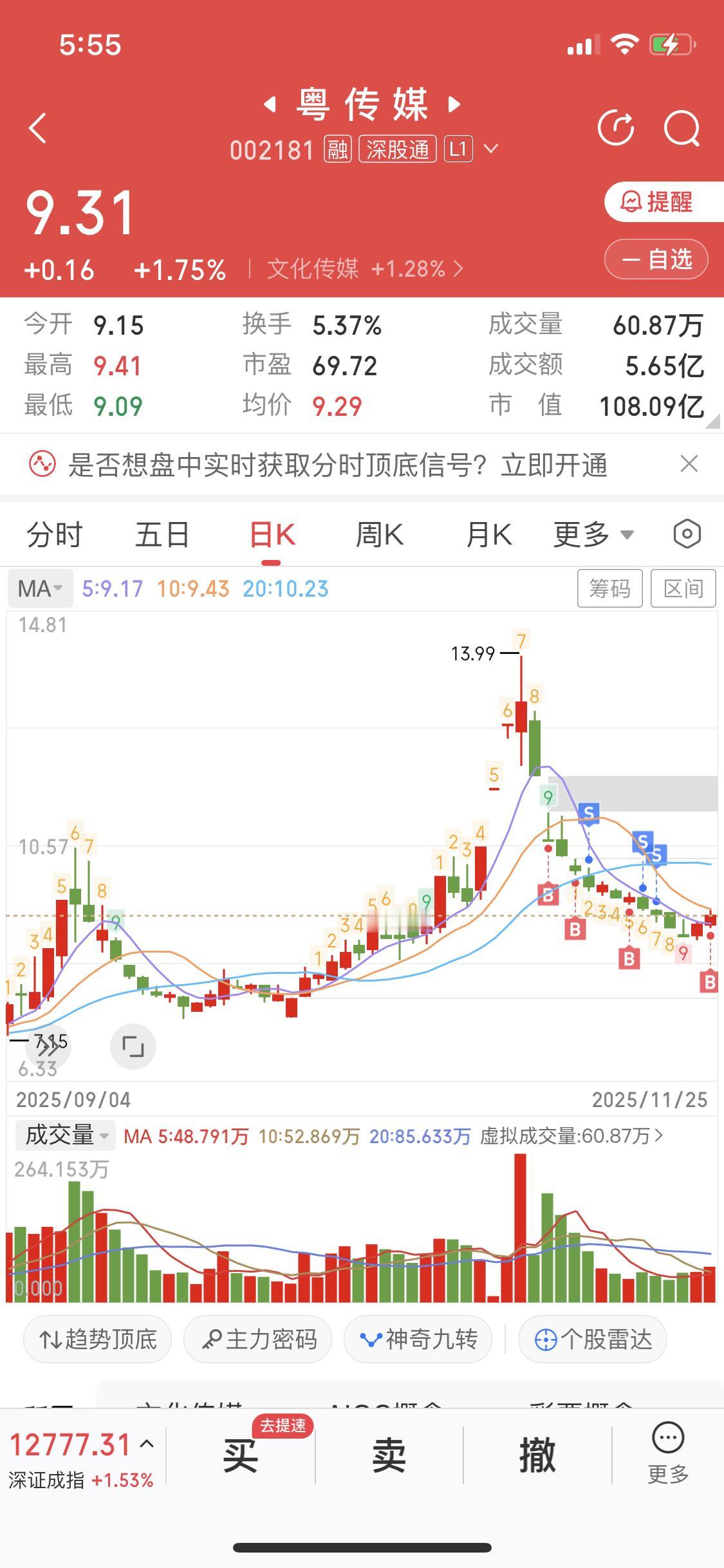 11月25日我加仓了粤传媒。当天它涨了1.75%,成交额达5.65亿元,主力净流入390.91万,股价以9.31元收盘,实现2连阳还成功站上5日均线。不过受10日均线9.43元压制,涨到9.41元就回落了。 这公司是首家获批准在主板上市的报业股,依托广州日报报业集团。业务多元,像广告、印刷等。旗下广报G视频发展不错,微短剧《志》还入选过优秀网络视听作品。有分析说其周线级别看涨,本周目标站上30日均线9.79元,希望这次加仓能有好回报。