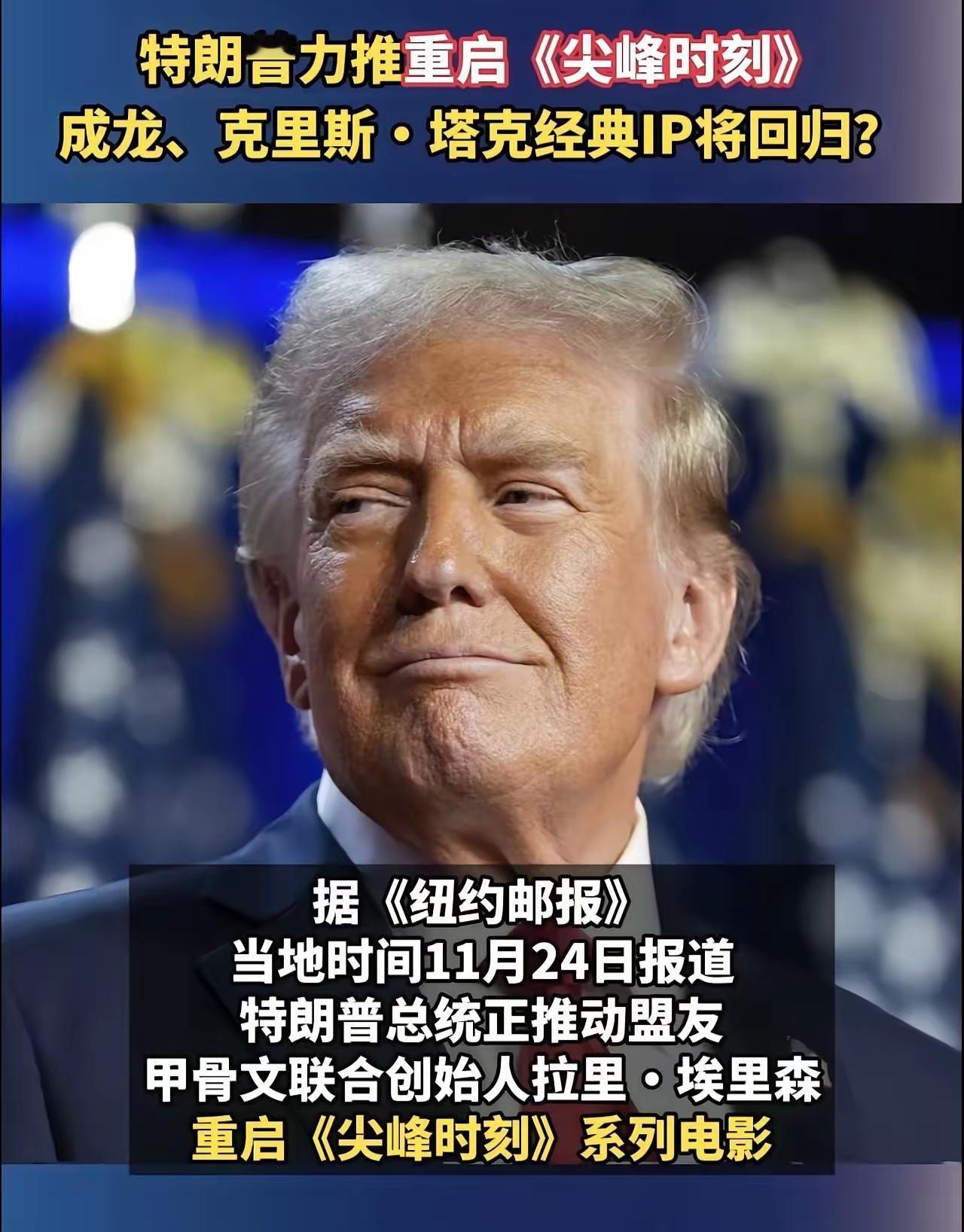 特朗普施压好莱坞,要求重启成龙和克里斯·塔克,续拍《尖峰时刻4》。网友:竟然为了这事儿? 惊天大瓜!特朗普居然是成龙电影迷?最近,他亲自下场施压,逼着派拉蒙影业公司,重启成龙,续拍《尖峰时刻4》,这操作直接炸穿全网! 据英媒爆料,特朗普盯上《尖峰时刻4》,不是心血来潮,而是把它当成第二个总统任期内的重要计划。特朗普扬言,要靠这部电影,让“传统男子气概”重返好莱坞。 要知道,当年成龙和克里斯·塔克的跨国搭档,堪称神级组合。香港警探的中式武打,混搭洛杉矶警探的美式拳脚,东西方文化碰撞出来的笑料,和酣畅淋漓的打斗场面,至今仍是无数人的童年回忆。 不过,有网友一眼看穿本质:《尖峰时刻》系列,恰好精准踩中了特朗普的胃口。一边是他想借经典IP刷热度,一边是妄图靠电影,输出自己的价值观,如此而已。 但问题来了,成龙如今年纪不小,还能重现当年灵活的武打招式吗?克里斯·塔克会不会回归,再续前缘?这波特朗普强行为经典电影续命的操作,到底是情怀杀,还是翻车预警?网友已经吵翻:“没了原班人马的灵魂,再拍也是毁经典!” 成龙 成龙国际地位
