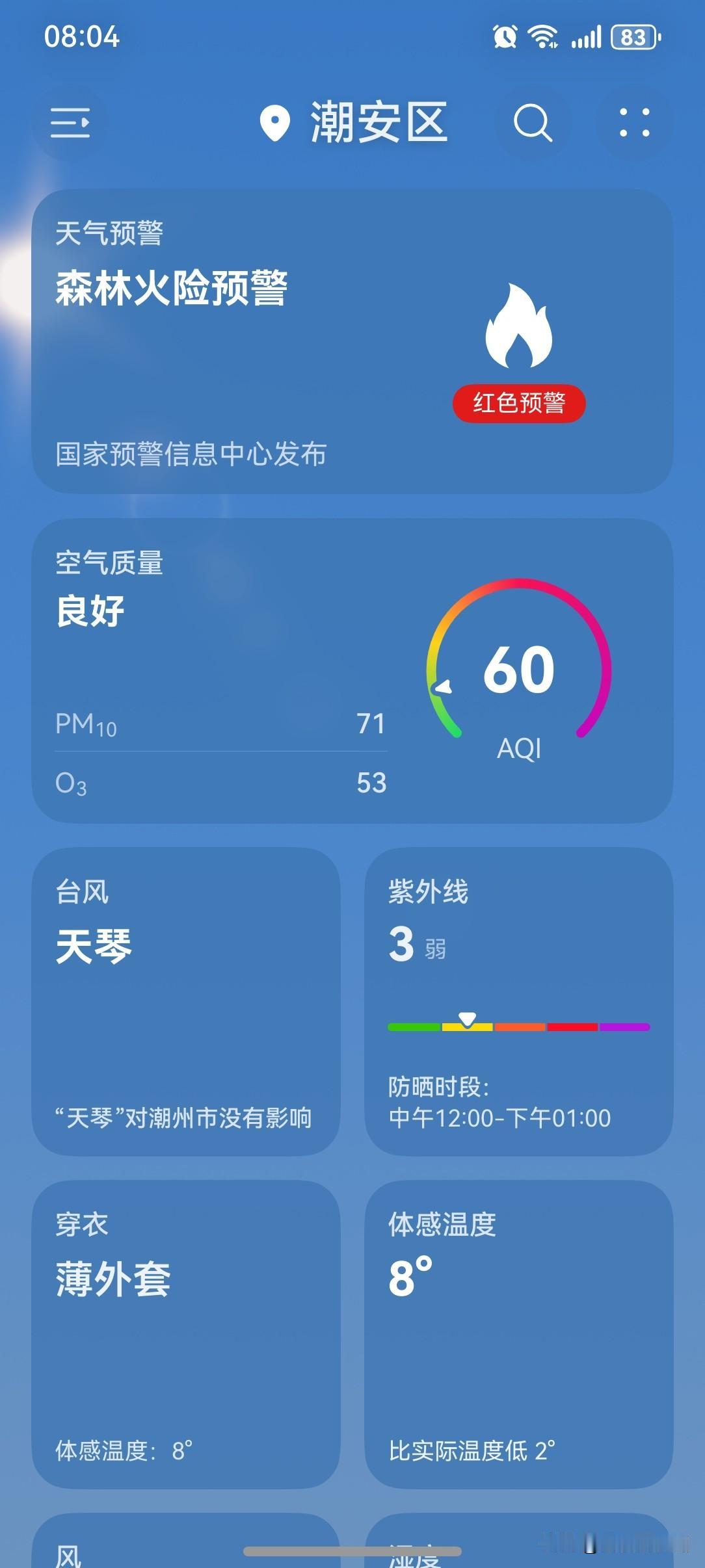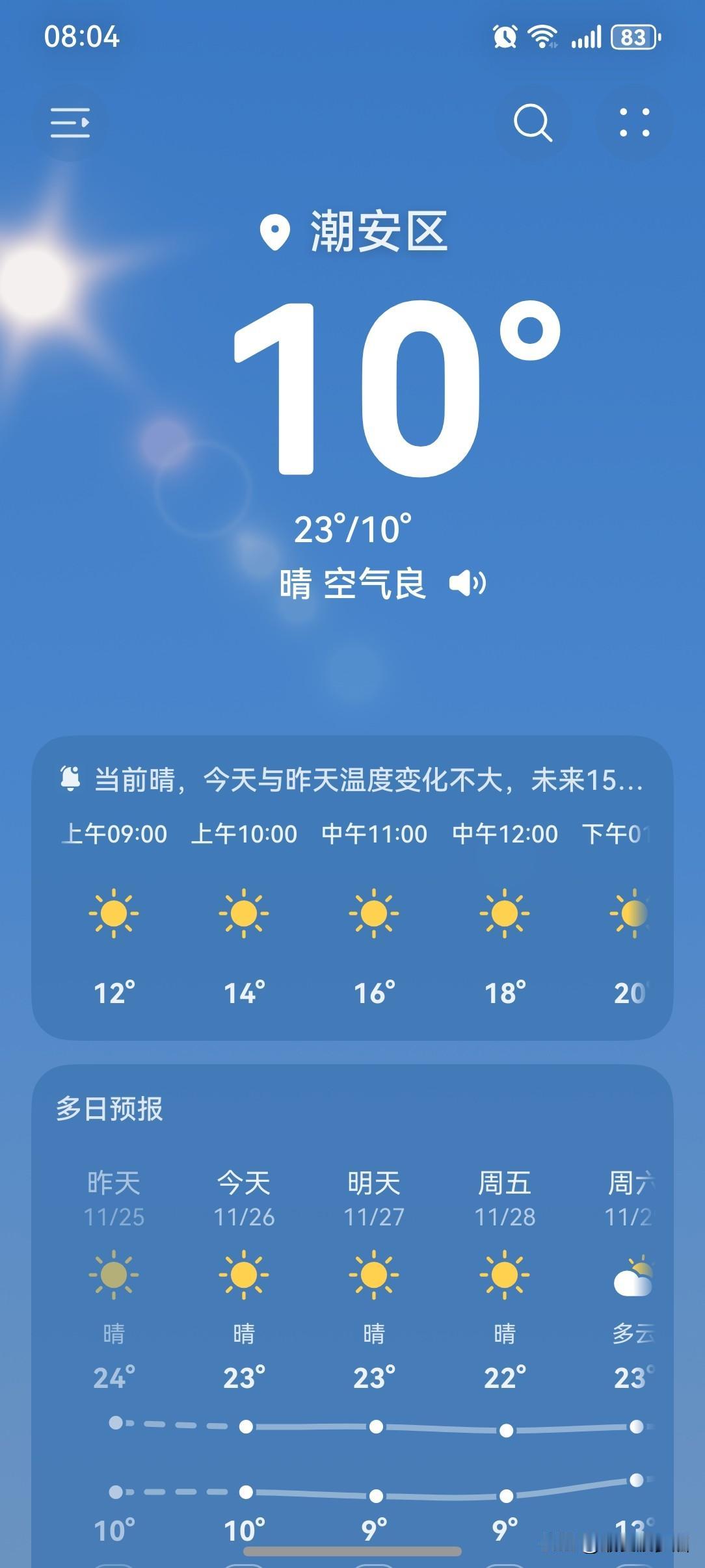 近期广东天气一如既往地晴朗干燥,广东人被风干啦!另外,弱冷空气频繁补充,早晚气温偏低,防寒保暖需做好。 26~28日,我省大部以晴天为主,昼夜温差大,早晚清(寒)凉,早晨粤北部分市县有5℃左右低温,我省海面有偏北风6~7级阵风8级。 今天(26日),潮州喜提一个大好晴天。气温10~23℃,此刻气温10℃,体感温度8℃。 看看今天的天空,云量比昨天多一点点,阳光虽然不是很明媚,但也足够耀眼。 在冷空气的影响下,气温小幅度下降,昼夜温差大。六点的早晨还是很冷的,手指、脚趾都能感受到有点冰冻。直到太阳缓缓升起,寒意才逐渐消失。 果然,阳光有利于万物!不仅能够滋养生命的成长,同时,还象征着希望、温暖和活力。 阳光总能给人一种积极、正面的力量,有阳光的日子真好! 今天的天气,依然值得五星好评! 如此天气!元芳,你怎么看?