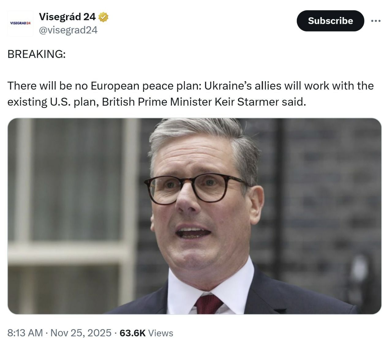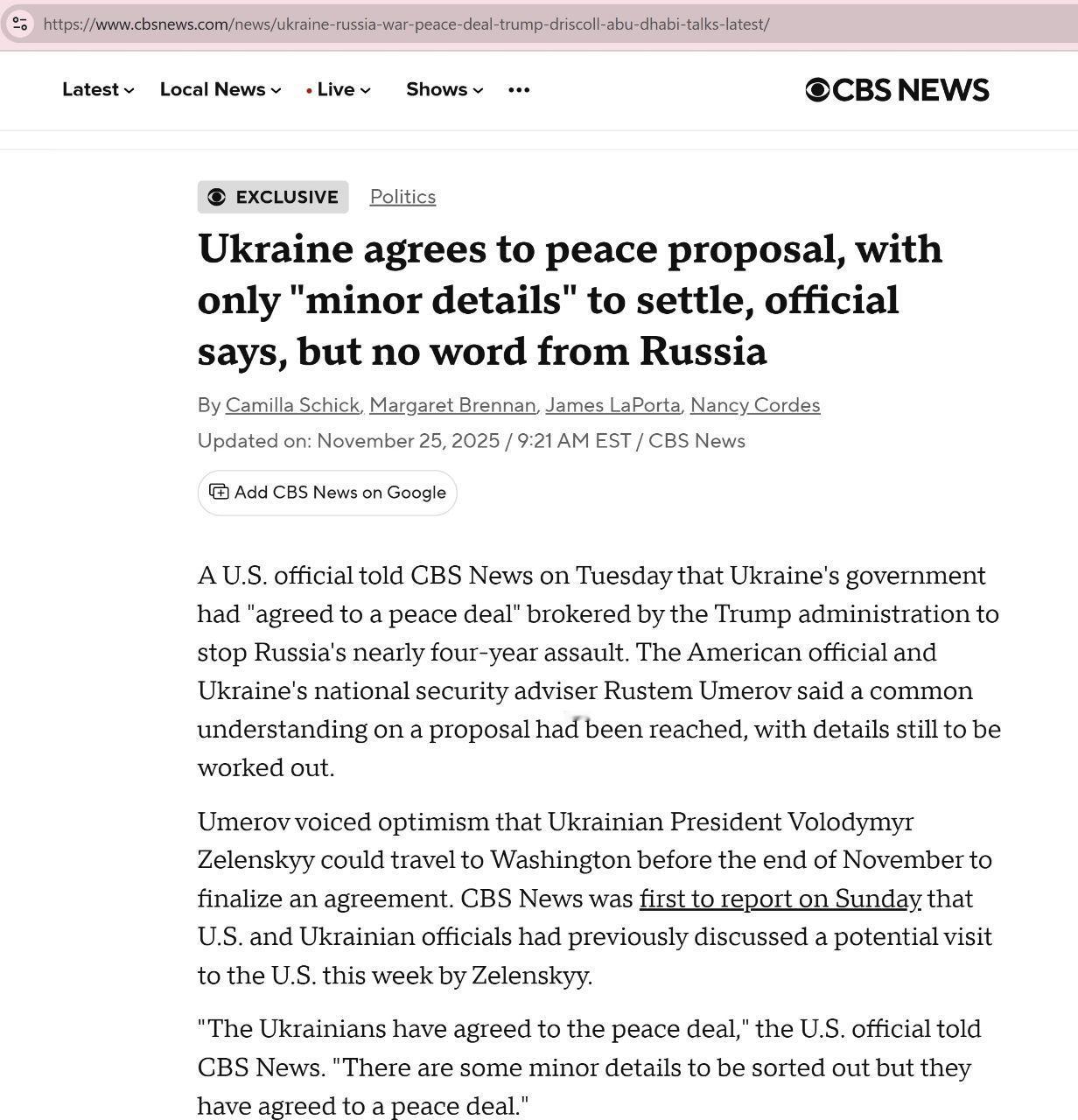 【美国之声--乌克兰接受川普政府斡旋的和平协议】2025年11月25日CBS:一名美国官员周二告诉CBS,乌克兰政府已“同意了一项和平协议”,该协议由川普政府斡旋,旨在制止俄罗斯近四年的攻势,但具体细节仍需进一步敲定。 乌克兰总统泽连斯基有望在十一月底前前往华盛顿,以最终敲定该协议。另:英国首相斯塔默(Keir Starmer )表示,乌克兰的盟友将配合现有的美国和平计划。