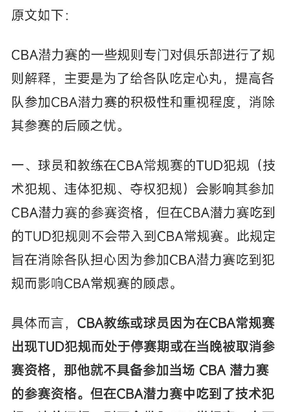 CBA新赛季第五节赛制出炉,乍一看还挺复杂! CBA新赛季开赛在即,CBA官方发布了新赛季潜力赛的规则制度,虽然各个俱乐部都持反对意见,但是没能阻止潜力赛的脱颖而出! 看了下规则大致总结如下! 1.潜力赛的技术犯规、违体犯规等不计入不计入常规赛。 2.潜力赛为非首发球员,因伤病等原因人数不够可使用主力。 3.弃权第二次CBA成绩取消! 看了潜力赛的规则就是让俱乐部重视起来,必须参加!