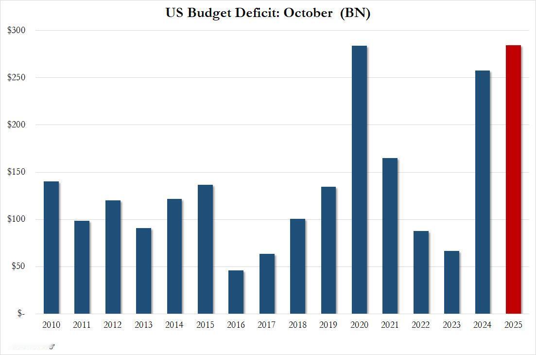 美国10月政府赤字2844亿美元,历史新高。国债利息支出1044亿美元,是2020年5倍虽然特朗普吹嘘关税收了不少,但美国2026新财年(10月至次年9年)的开端是历史最高的10月赤字,2844亿美元。这甚至超过了2020年疫情期间特殊的2841亿美元。对美国政府财政最不利的是激增的国债利息,2020年时利息负担不重。图二,10月所有主要支出类别均有所增加,但最显著的是国债利息持续激增,过去12个月达到1.24万亿美元,正迅速逼近社会保障(1.589万亿美元)成为政府支出的最大来源。图三,每年10月的国债利息支出,2025年10月是1044亿美元,而2020年10月只有200亿美元。现在,美国人每缴纳一美元税款,有24美分用于支付国债利息。马斯克说这样不行,要DOGE砍支出,制止国债利息飙升,但已经不干了。现在没人在意美债利息怎么回事了,只要最近几年不出事就行了。