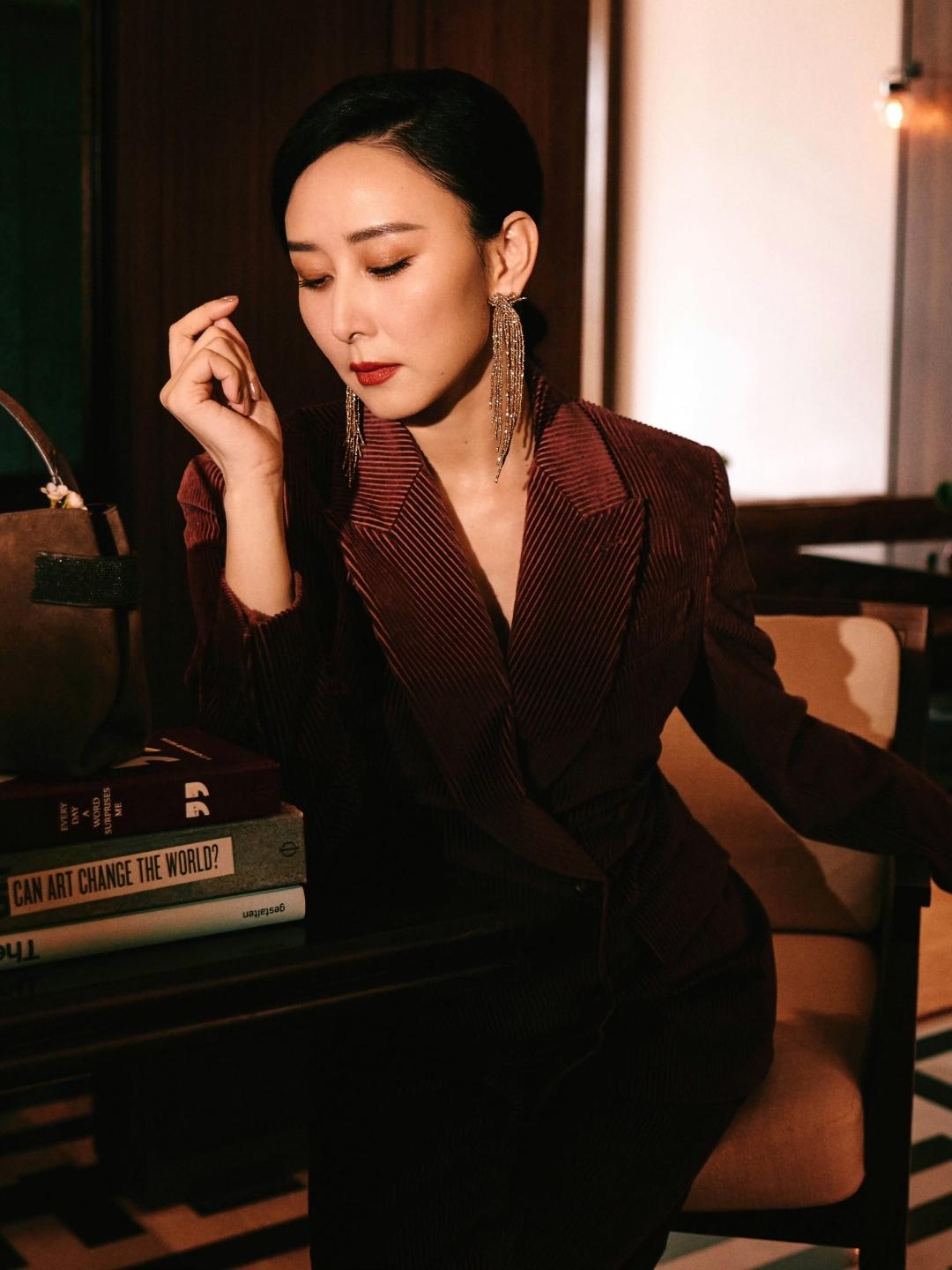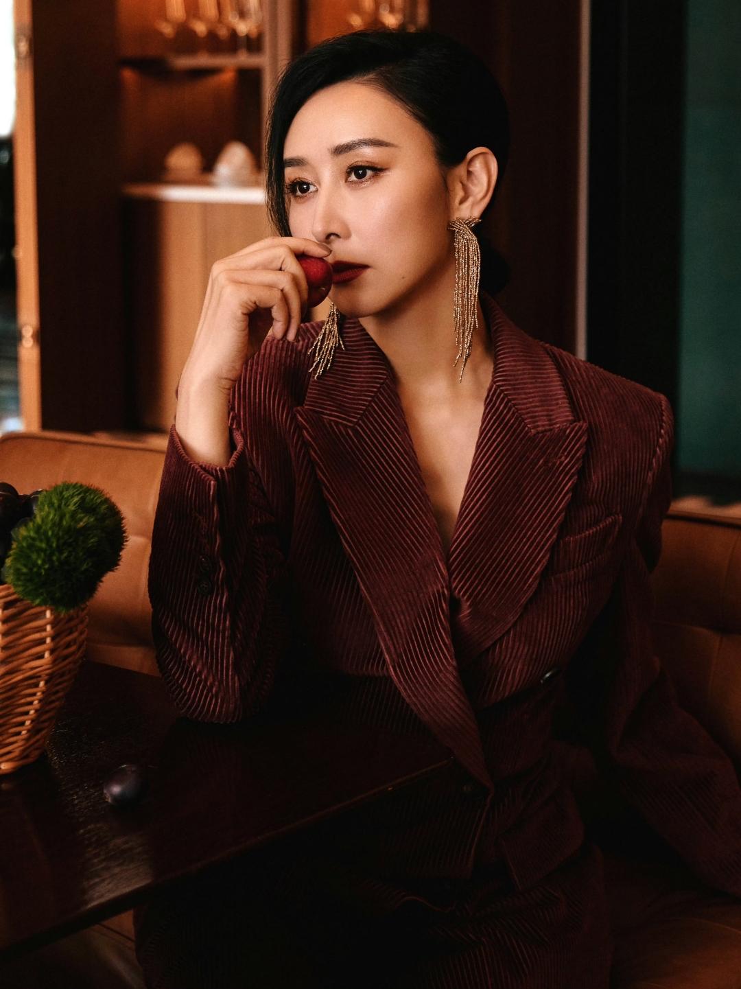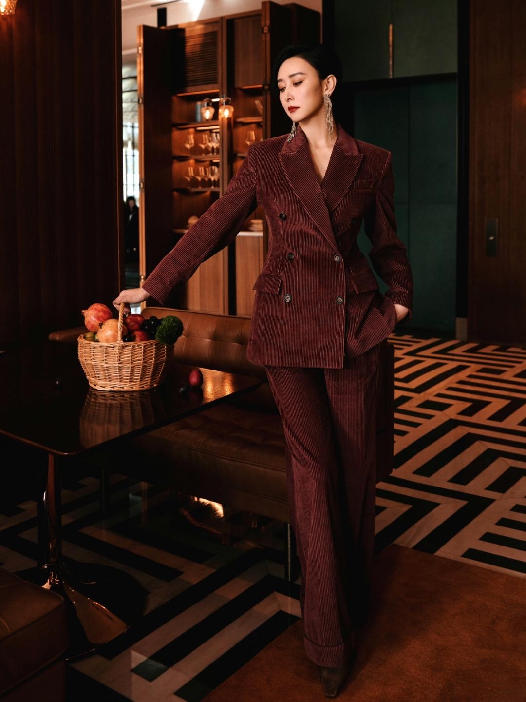胡静这组酒红色竖纹西装造型,直接把“优雅野心家”焊在身上了✨