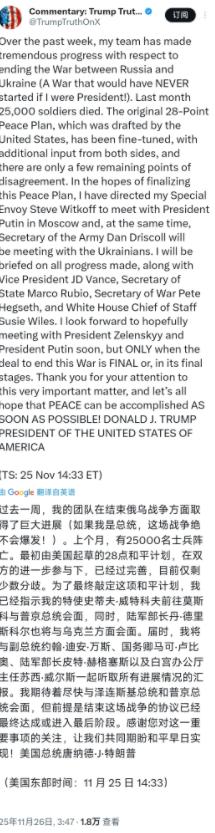 特朗普今天(北京时间11月26日)写道:“过去一周,我的团队在结束俄乌战争方面取得了巨大进展(如果我是总统,这场战争绝不会爆发!)。上个月,有25000名士兵阵亡。最初由美国起草的28点和平计划,在双方的进一步参与下,已经过完善,目前仅剩少数分歧。为了最终敲定这项和平计划,我已经指示我的特使史蒂夫·威特科夫前往莫斯科与普京总统会面,同时,陆军部长丹·德里斯科尔也将与乌克兰方面会面。届时,我将与副总统万斯、国务卿鲁比奥、战争部长赫格塞斯以及白宫办公厅主任苏西·威尔斯一起听取所有进展情况的汇报。我期待着尽快与泽连斯基总统和普京总统会面,但前提是结束这场战争的协议已经最终达成或进入最后阶段。感谢您对这一重要事项的关注,让我们共同期盼和平早日实现!” 这段话迅速引发了各方关注,毕竟俄乌冲突已经持续多年,期间无数次的和平尝试都未能取得实质性突破,这次特朗普突然抛出“巨大进展”的说法,自然吊足了外界的胃口。 他在文中提到上个月有25000名士兵阵亡,这个数字让不少人感到揪心,也从侧面反映出这场战争至今仍在造成大量人员伤亡,和平的迫切性愈发凸显。不过对于这个伤亡数据的具体来源和统计范围,目前还没有权威机构进行核实,各方对此也保持着谨慎的态度。 紧接着特朗普谈到了核心的和平计划,他表示最初由美国起草的28点和平计划,在俄乌双方的进一步参与下已经过完善,目前仅剩少数分歧。这个28点计划此前从未被公开过细节,外界只能从只言片语中推测其可能涉及停火协议、领土划分、人道主义援助等多个关键领域。 双方参与完善计划的过程本身就值得关注,这至少说明俄乌两国在和平谈判上存在一定的意愿,不再是此前完全对立的状态,仅剩少数分歧的表述也让外界看到了达成协议的希望。 为了最终敲定这项和平计划,特朗普已经做出了具体的行动部署,他指示特使史蒂夫·威特科夫前往莫斯科与普京总统会面,同时安排陆军部长丹·德里斯科尔与乌克兰方面会面。这一系列的外交动作显示出其团队想要推动和平进程的实际努力,而非仅仅停留在口头表态。 史蒂夫·威特科夫作为特朗普指定的特使,其过往的外交经历和与俄方的沟通基础将在这次会面中起到重要作用,而丹·德里斯科尔与乌克兰方面的接触,则需要充分了解乌方的核心诉求,为后续的整体协商打下基础。 特朗普还提到,届时自己将与副总统万斯、国务卿鲁比奥、战争部长赫格塞斯以及白宫办公厅主任苏西·威尔斯一起听取所有进展情况的汇报。这个豪华的听取汇报阵容,既体现了对这项和平计划的重视程度,也暗示着后续决策将是多方共同参与的结果。 副总统、国务卿等核心官员的参与,能够从不同维度对谈判进展进行评估,确保和平计划的各个方面都得到充分考量,避免因单一视角导致决策偏差。 他在文末表达了期待尽快与泽连斯基总统和普京总统会面的愿望,但明确提出前提是结束这场战争的协议已经最终达成或进入最后阶段。这个前提条件设置得十分关键,既展现了对和平成果的重视,也避免了在没有实质进展的情况下进行无意义的会面。 毕竟此前国际社会多次组织俄乌双方领导人会面,均因分歧过大未能取得成效,特朗普此次谨慎的态度,或许是吸取了过往的经验教训。 不过需要注意的是,目前特朗普并非美国现任总统,其团队在推动俄乌和平进程中能够发挥的实际影响力仍有待观察。美国作为在国际事务中具有重要话语权的国家,其政策导向确实会对俄乌冲突产生影响,但非官方身份的斡旋,在力度和资源调动上必然会受到一定限制。 而且俄乌冲突涉及的利益方众多,除了俄乌两国本身,还牵扯到欧盟、北约等多个国际组织和国家的利益,任何和平计划的达成都需要兼顾各方诉求,绝非仅凭美国一方或特朗普团队就能轻易实现。 对于特朗普提到的“如果我是总统,这场战争绝不会爆发”这句话,外界也有不同的解读。有人认为这是他对自己外交能力的自信展现,也有人觉得这是一种事后诸葛亮式的表述,毕竟战争爆发的原因错综复杂,涉及历史、地缘政治等多个层面,不能简单归咎于某一届政府的决策。 当前国际社会最关心的还是特朗普团队所说的“巨大进展”究竟体现在哪些方面,仅剩的少数分歧又是什么。这些关键信息的缺失,让外界对和平计划的可行性仍存有疑虑。如果这些分歧涉及到克里米亚等核心领土问题,那么想要达成一致恐怕还有很长的路要走。