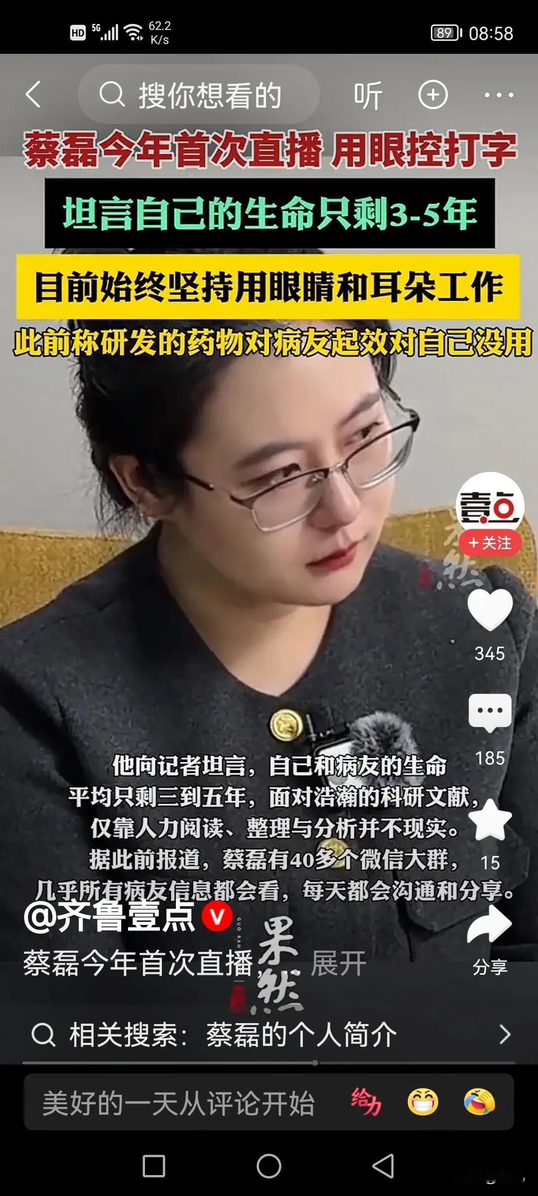 有人称:蔡磊是悬崖举灯的人,没照亮自己,却暖了一群人。 蔡磊自己坦言:只有3到5年的寿命了。最后一颗子弹什么时候打光我觉得不太重要了。他韧性为刃,破冰可期,纵使不敌,决不屈服的精神还是值得称赞的。 前两天蔡磊直播间连线蔡磊,我看到了他的视频,目前用眼控打字,用耳朵工作,我看到很多人喜欢他。 蔡磊直播间的韭菜当不当那是自己的事,被他蒙骗没有那是自己的智商,没必要对一个病人恶语中伤,最起码人们因为蔡磊研究对渐冻症患者有了认识,甚至看到了希望。 蔡磊身残志坚,挥舞金箍棒的时候,我们就不要在他背后喊:“快露原形!”我们应该喊:“坚强的战士!”,我已经给他竖起大拇指👍。