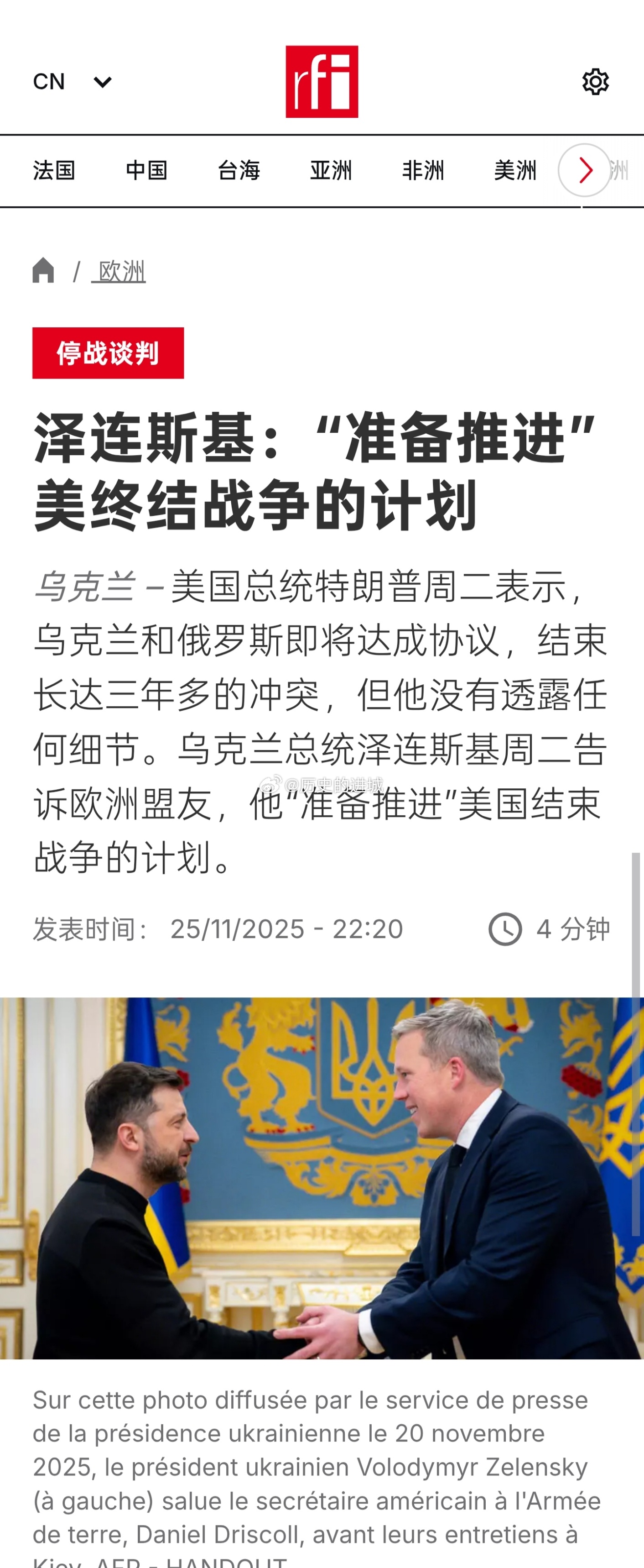 美国总统特朗普周二表示,乌克兰和俄罗斯即将达成协议,结束长达三年多的冲突,但他没有透露任何细节。乌克兰总统泽连斯基周二告诉欧洲盟友,他“准备推进”美国结束战争的计划。