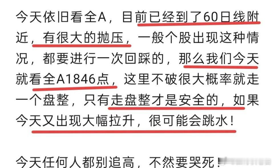 今天全A的关键是在1846.7点上方窄幅震荡,不要再拉升;只要下午一拉,明天的上涨预期就会被破坏。所以盯紧这个点位就行:破掉没有预期,拉升也没有预期,只有在这上方稳住并小幅波动,才保留预期。