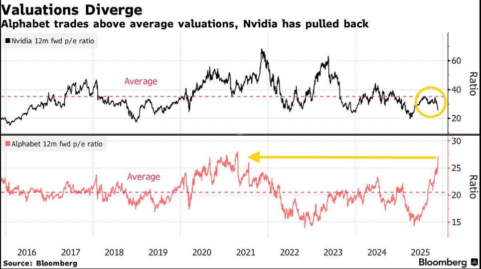 美股科技巨头的分化:随着股价近期下跌,$NVDA英伟达的预期市盈率回调至自4月以来最低,远低于过去十年平均值 35;相比之下 ,$GOOG Alphabet的这一数字飙升至2021年以来最高。
