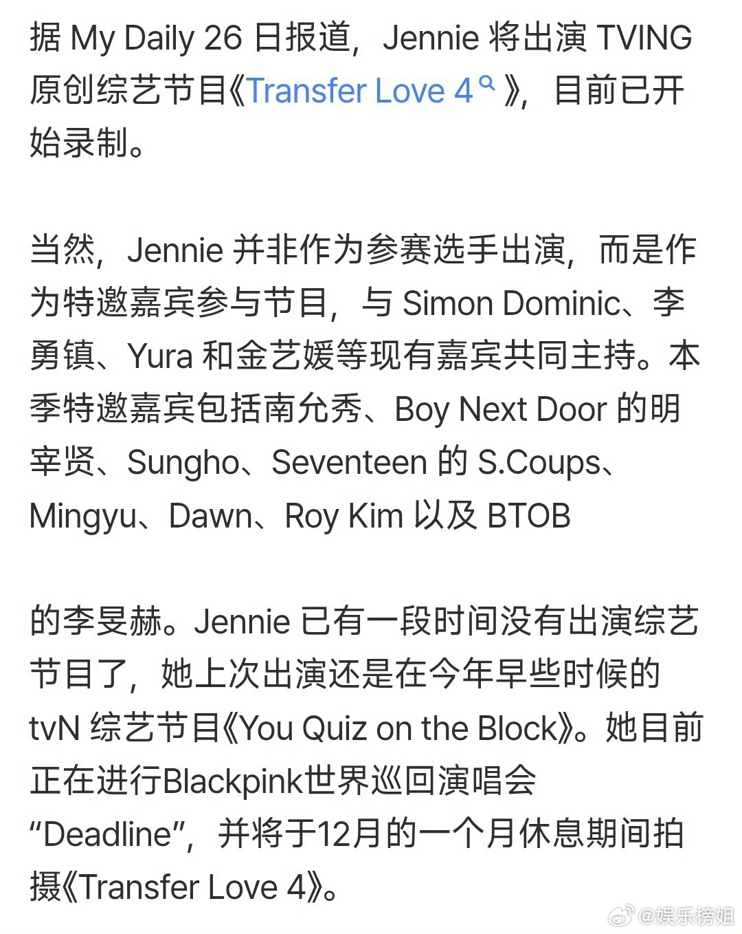 jennie将出演换乘恋爱4 据韩媒,Jennie将出演TVING原创综艺节目《换乘恋爱4》,这次她并非以参与加者出演,而是作为演播室特别嘉宾亮相,与现有嘉宾作为观察团共同参与节目进行互动。 好好好,期待综艺小妮换乘恋爱