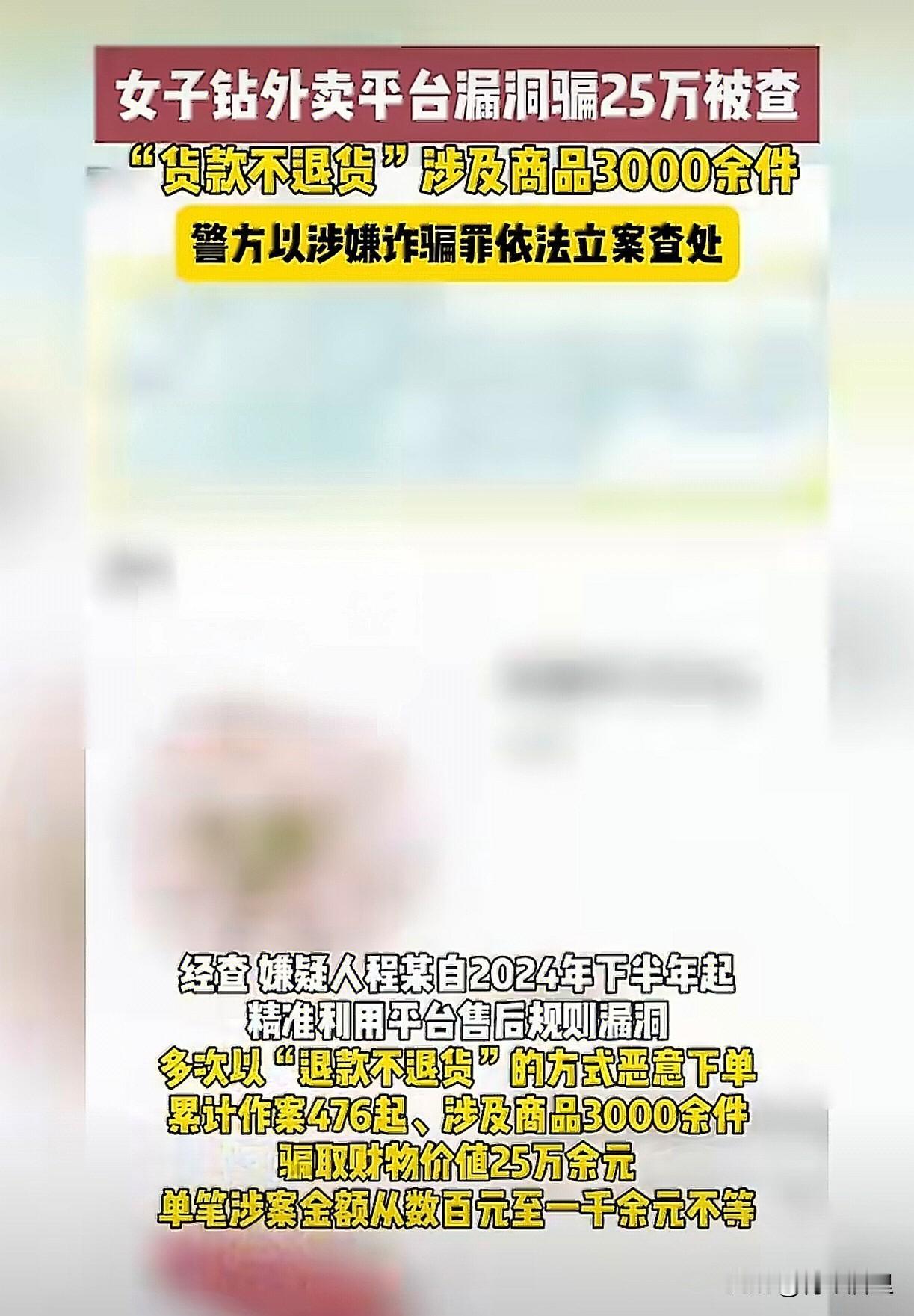 这羊毛薅的可真“刑”啊! 浙江台州一名50多岁的女子,两年内在外卖平台下单476次,利用平台的漏洞,次次申请退款不退货,硬生生从一家商超“薅”走总计价值25万的商品。因最近一次薅羊毛协商退款的时候行为反常才被商家发现,被告知已经触犯法律,女子最终选择投案自首。 最后警方追回部分货物,女子及家属也赔偿了剩余损失。但涉案金额巨大、次数众多,该女子也因涉嫌诈骗罪被立案调查了。 真不知她在想些啥,胆子也是真大,专逮一家薅,还薅了两年。得亏这是家大型超市,要是个小超市,不得给人家薅破产了啊[捂脸]。社会新闻 免费薅羊毛