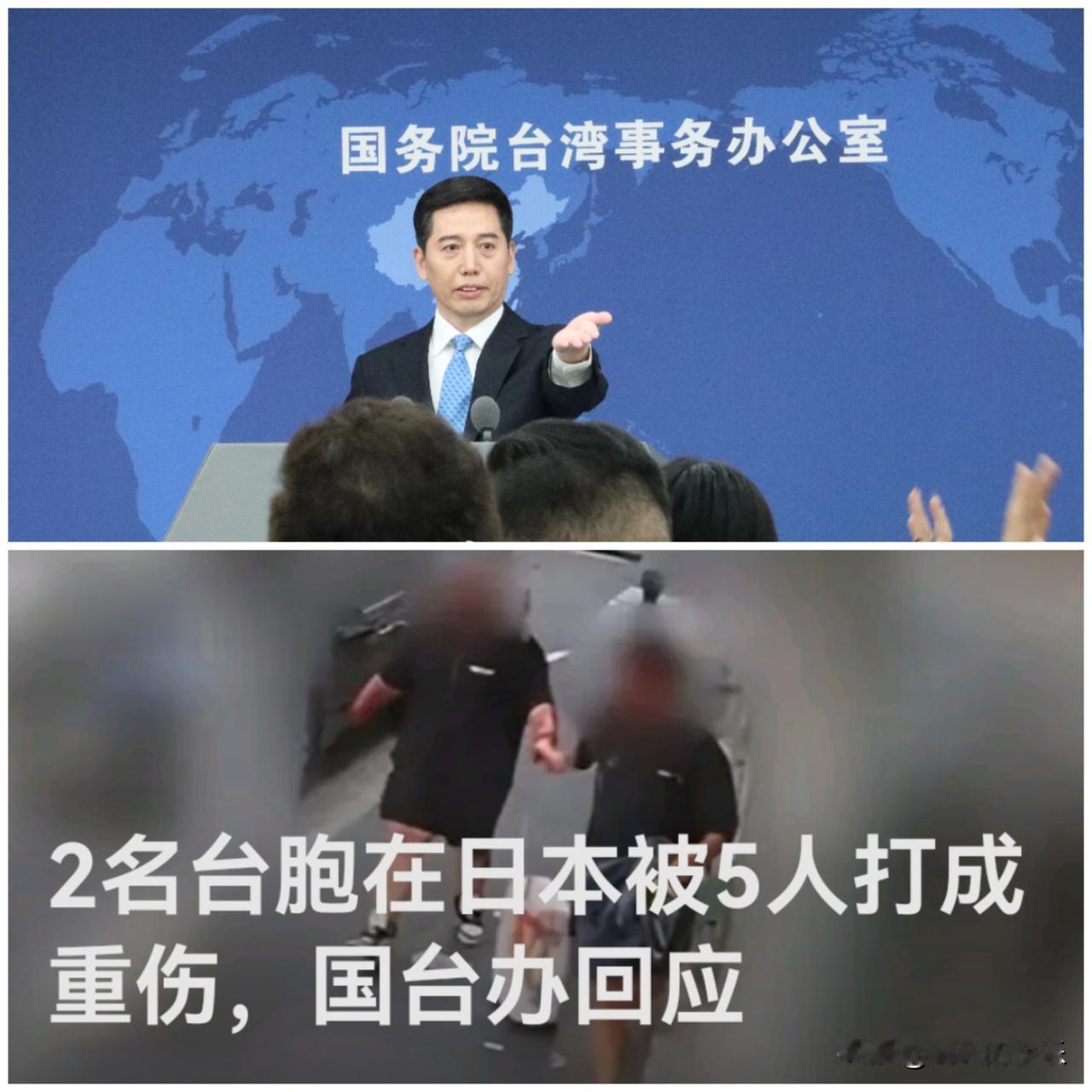 2名台胞在日本被5人打成重伤,国台办回应 据媒体报道26日,国台办举行例行新闻发布会。 据报道,2名台胞今年7月在日本东京街上行走时,被5名日本男子打成重伤。日本警方近期表示已逮捕涉案袭击者。 对此,发言人彭庆恩表示,今年以来,日本社会治安不靖,发生多起包括台湾同胞在内的游客遇袭事件。 近日,日本首相公然发表涉台露骨挑衅言论,严重恶化人员交流氛围,日本社会右翼分子反华仇华极端行为增多,给游客人身和生命安全带来重大风险。 台湾同胞是我们的骨肉天亲。我们强烈谴责类似的暴力行为,日方应尽快严惩肇事者。