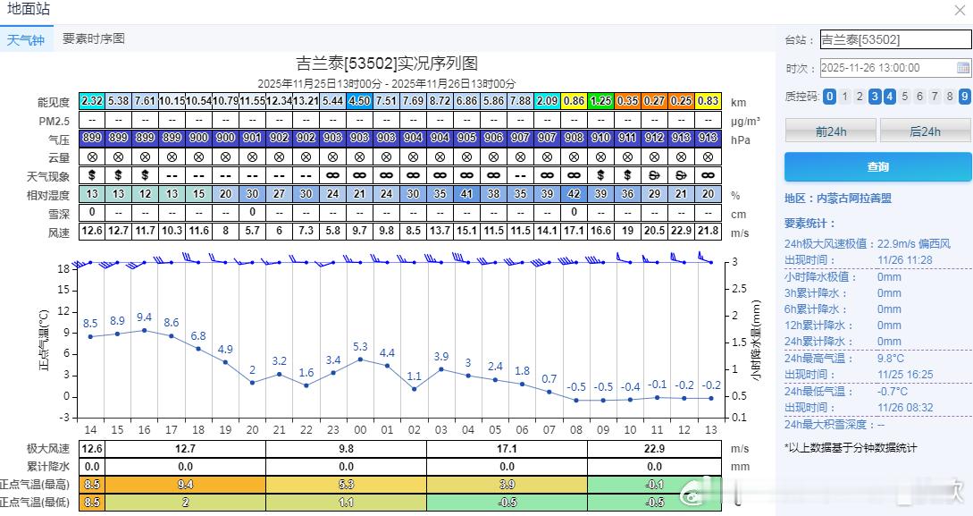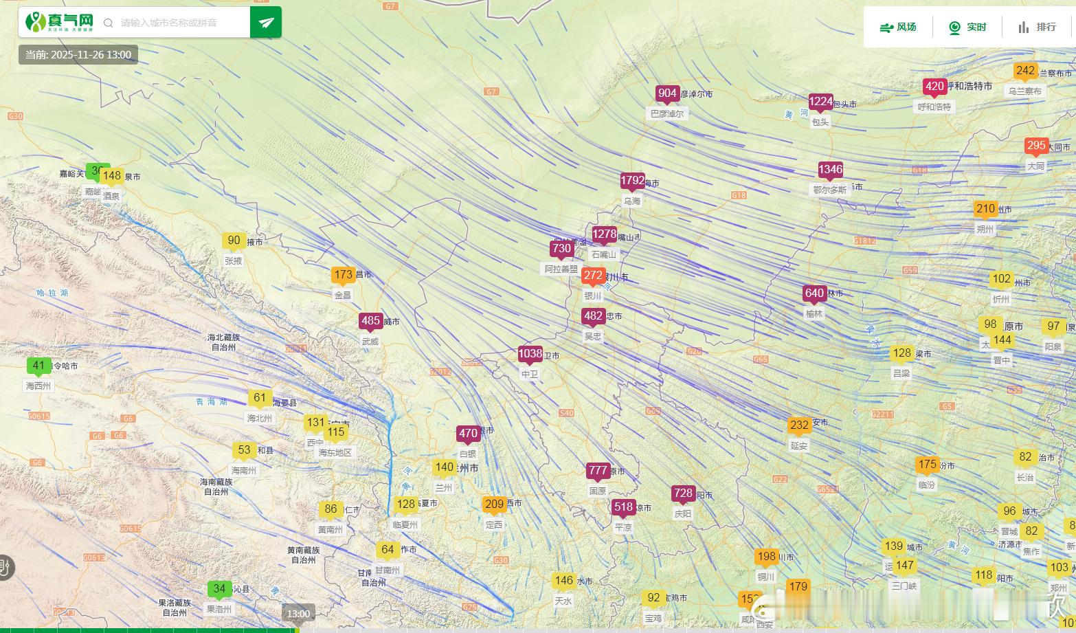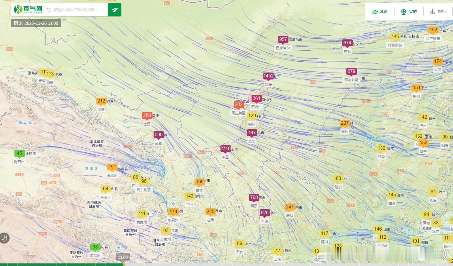 【沙尘】今天沙尘在冷空气西北风推动下,总体向东南移动。9时-13时PM10浓度,宁夏中卫、内蒙古乌海、鄂尔多斯,一度超2000微克/立方米。在秋冬季出现如此强的沙尘不多见。内蒙古吉兰泰在中午12时还出现了强沙尘暴。13时沙尘前沿已经抵达呼和浩特,未来会继续向东南推进。