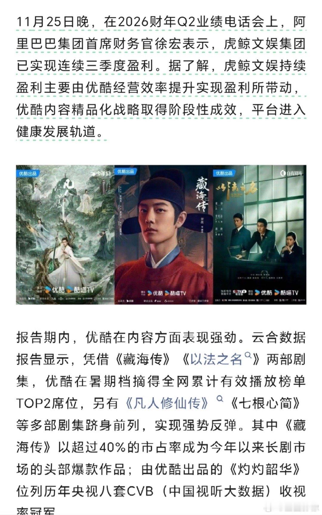 优酷发的这连续三季度盈利,我看见有人把下面全部涂掉,把中间也涂掉只剩一个,实际上优酷今年播的能拿出手的就只有藏海传,我并没有拉踩,以法之名我也看了,不烂尾的话这个档当时接的确实不错,可惜烂尾是事实,即便全员演技也都很ok也还是有遗憾的。不然优酷今年可以实现古装现代剧双鬼拍门,断层碾压鹅桃。然后其余后面的就算了,有些人尬吹真的没必要。没藏海传的话,今年的酷是相对失败的,因为2025年马上就结束了
