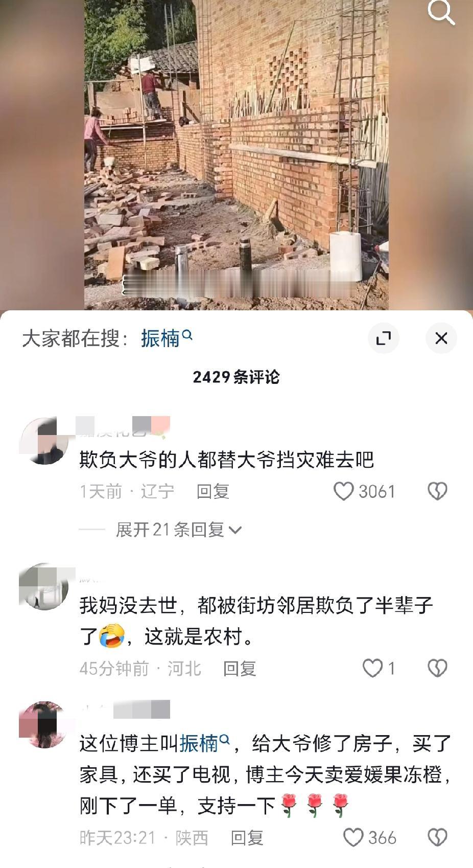 大爷太苦了!房子被亲妹妹霸占,只能流浪住在山里,又被村民断水断电。好在遇到了好心的网红博主,给他翻修房子,陪他过冬。 这是一个暖心的故事。大爷一生无儿无女,没有结婚。他的房子被他的亲生妹妹给霸占了。妈妈去世以后,兄弟姐妹和邻居都欺负他。 他穿着从外面捡来的别人扔掉的旧衣服旧鞋,靠在山上挖中药,去集市上卖点钱维持生计。他因为贫穷被人嘲笑什么都买不起。他的亲哥哥为了占他家宅基地,在他的堂屋种了一棵被认为不吉利的杨树。 农村人都比较迷信,大爷因为忌讳就不敢住,被兄弟姐妹逼着住到了山里几十年。村民们故意堵住通水管道,他只能来回往返到山脚下挑水喝。他种了好多年的栗子树也被恶意砍伐。砍不完的就被下药或者烧坏树根。 当大爷挖不到草药时,大爷只能靠在大山里捡板栗熬过寒冬。网友问他:一个人住山上是否孤独?大爷说“不孤独,因为爸爸妈妈都葬在这里。” 后来大爷遇到了一位好心的网络博主振楠,给大爷修了房子,买家具,还买了电视。网友对博主的爱心表示感动,特意还在博主的链接里,买下了爱媛果冻橙,支持他一下。