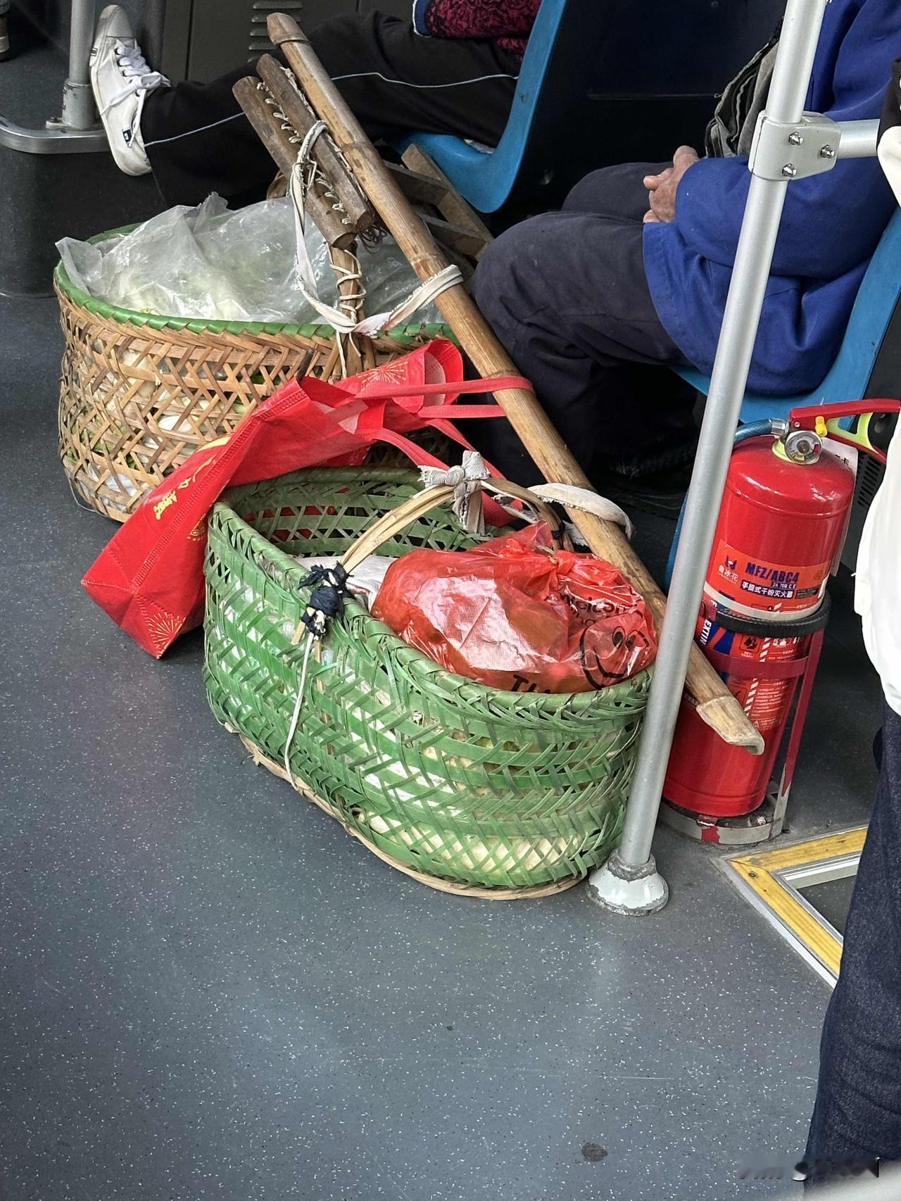 晒图笔记大赛公交车上,大爷挑了两个蓝子的菜,去城里卖。一个是竹蓝,家里种的竹子编的,竹蓝的上面一圈用晴纶的编织带镶嵌了一道箍,这个竹蓝想必用了很久吧,竹蓝里放的是白菜。还是一个晴纶编织带做的蓝子,里面放的是萝卜。都是大爷自己种的菜,挑到城里来卖,换回一点点的辛苦钱吧