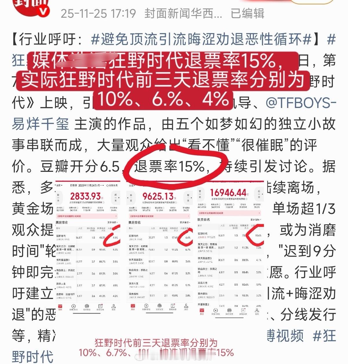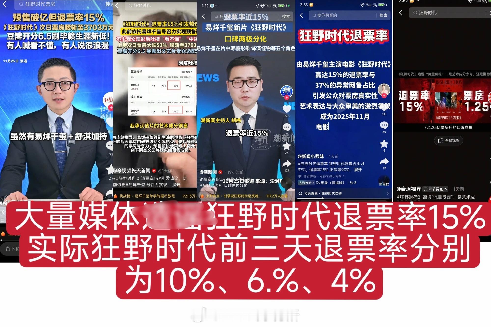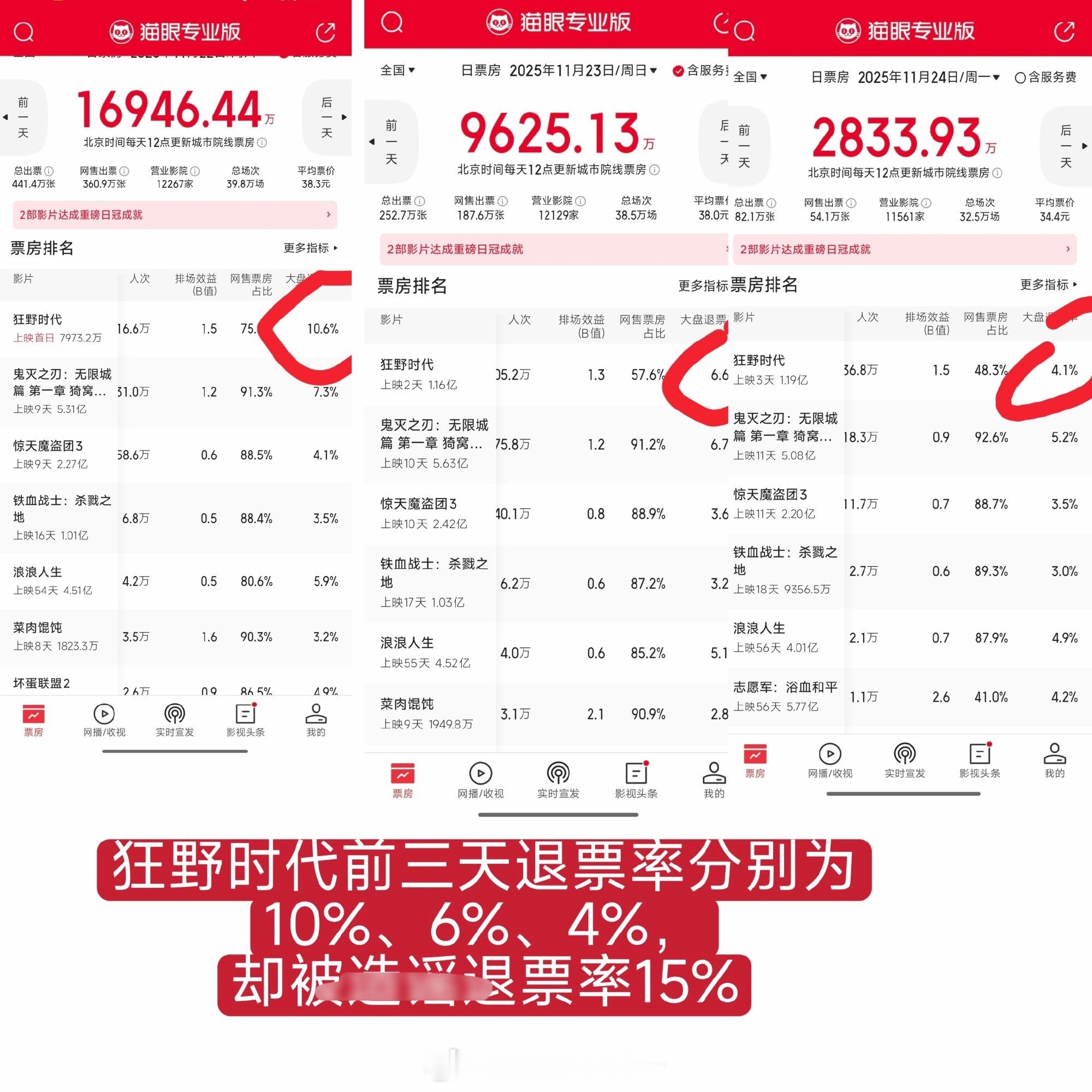 易烊千玺《狂野时代》是不是被做局了,根据猫眼专业版数据,上映前三天退票率为10%、6%、4%,属于档期正常水平,但各平台大量媒体报道狂野时代退票率15%🤔