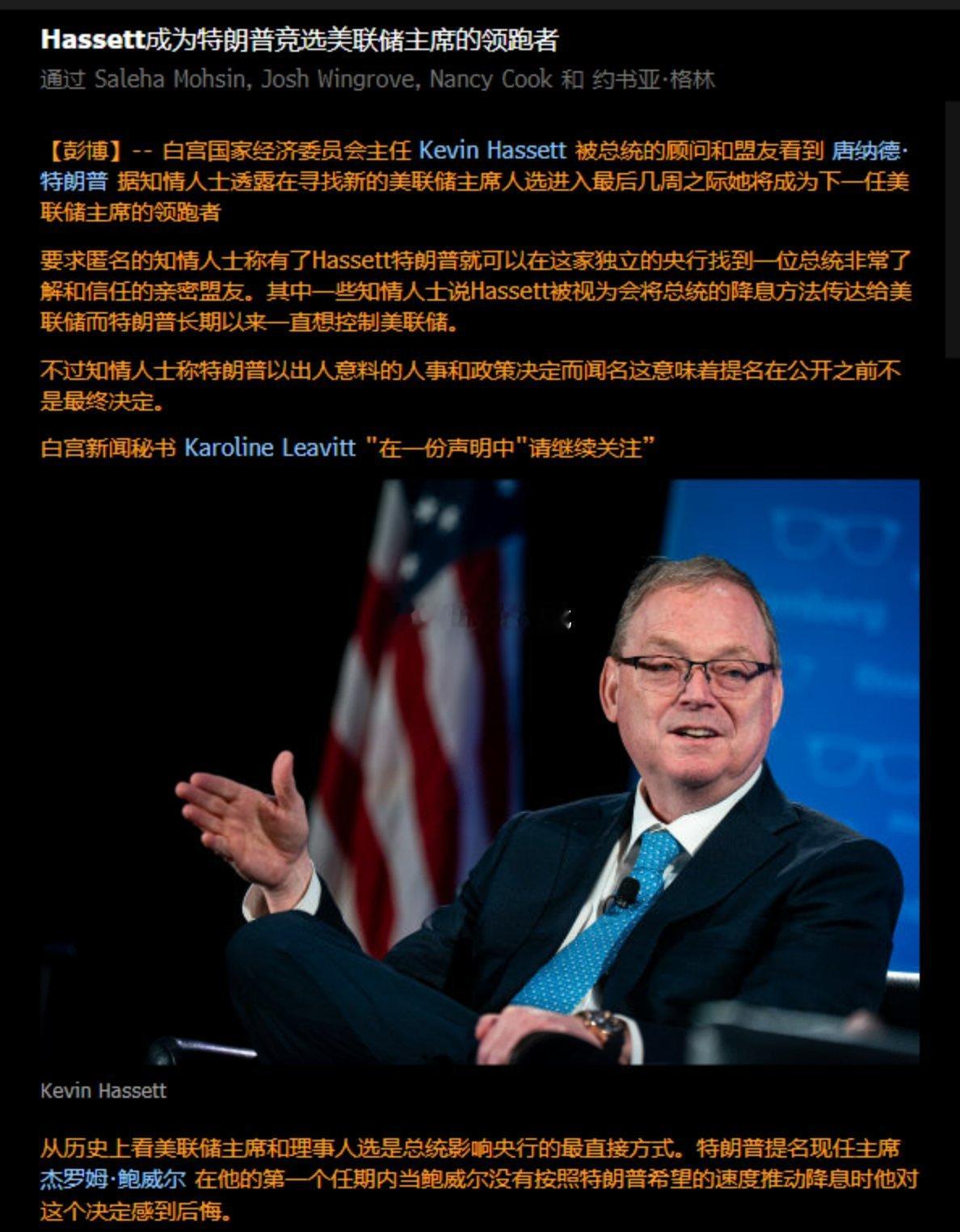 彭博社:特朗普圈内人认为国家经济委员会主任凯文·哈塞特已成下任美联储主席头号热门,遴选进入最后几周。若成真,特朗普将把最信任的亲密盟友送进独立的央行,哈塞特也被视为可能把特朗普一贯想要的更快降息路线带进美联储。白宫发言人莱薇特:没人知道总统会做什么,等着看。