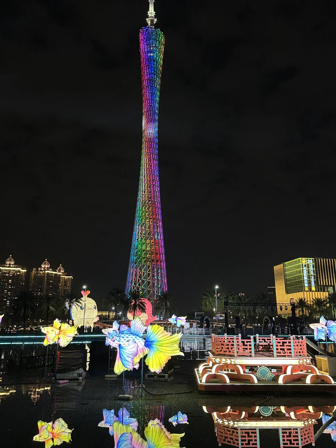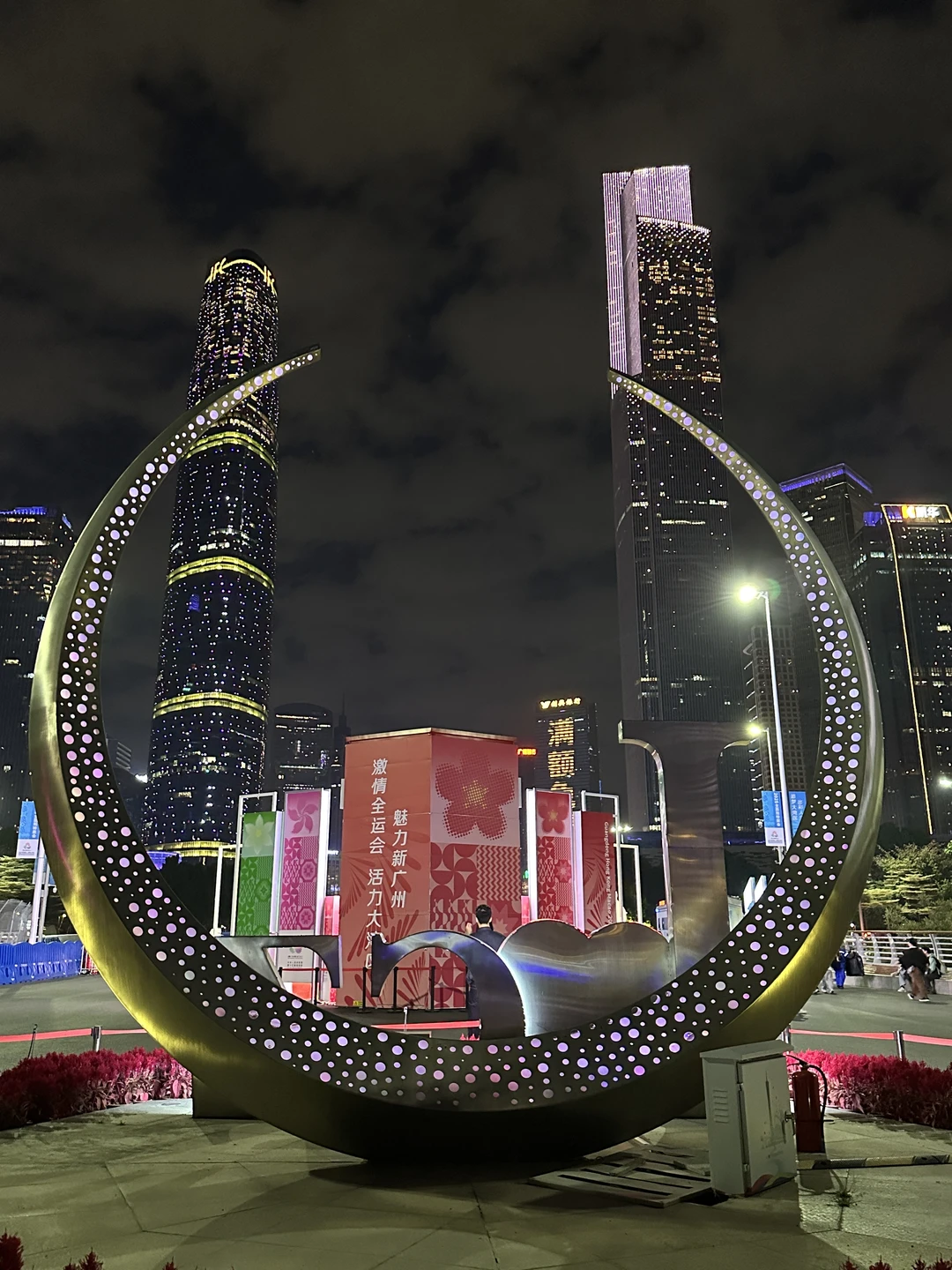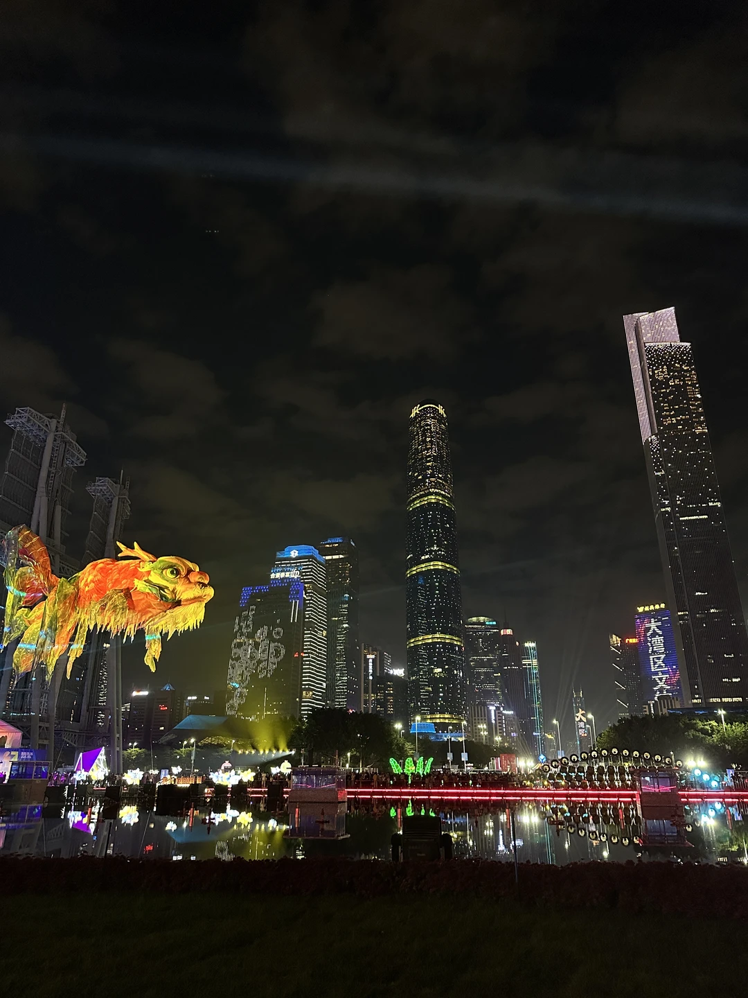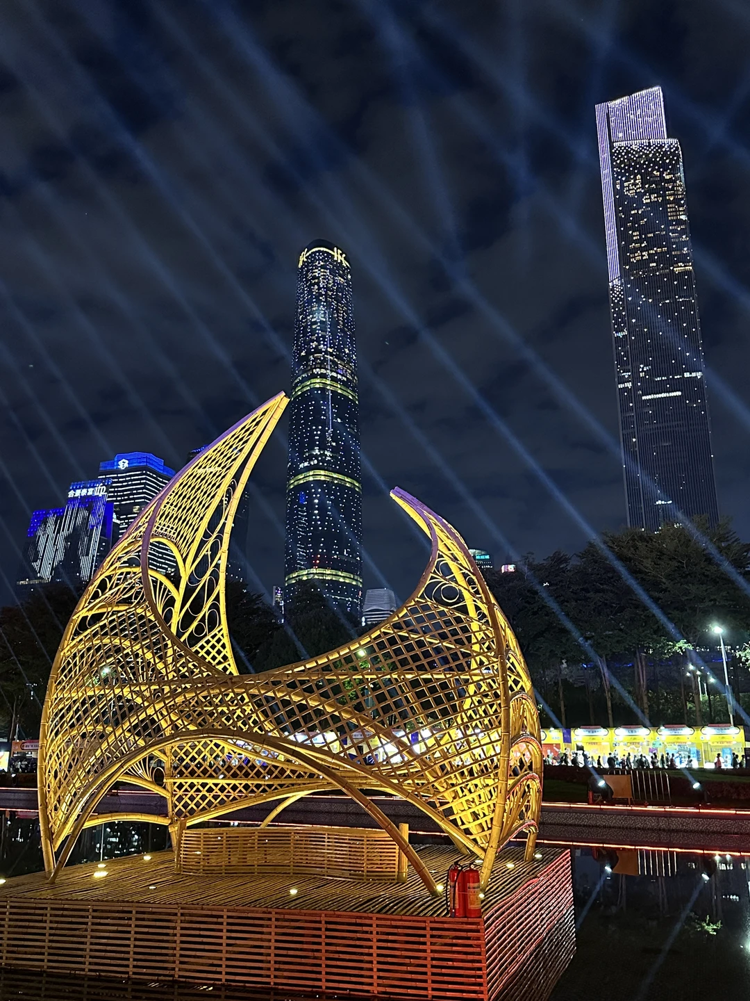 除了两大重头戏,海心沙内场的灯光装置也没让人失望!顺着指示牌走,能拍到花城汇、珠江新城的夜景,灯光节的激光扫过CBD的建筑,像科幻电影里的场景。还有沿途的光影走廊,暖光灯带延伸到尽头,拍出来的线条感超绝。