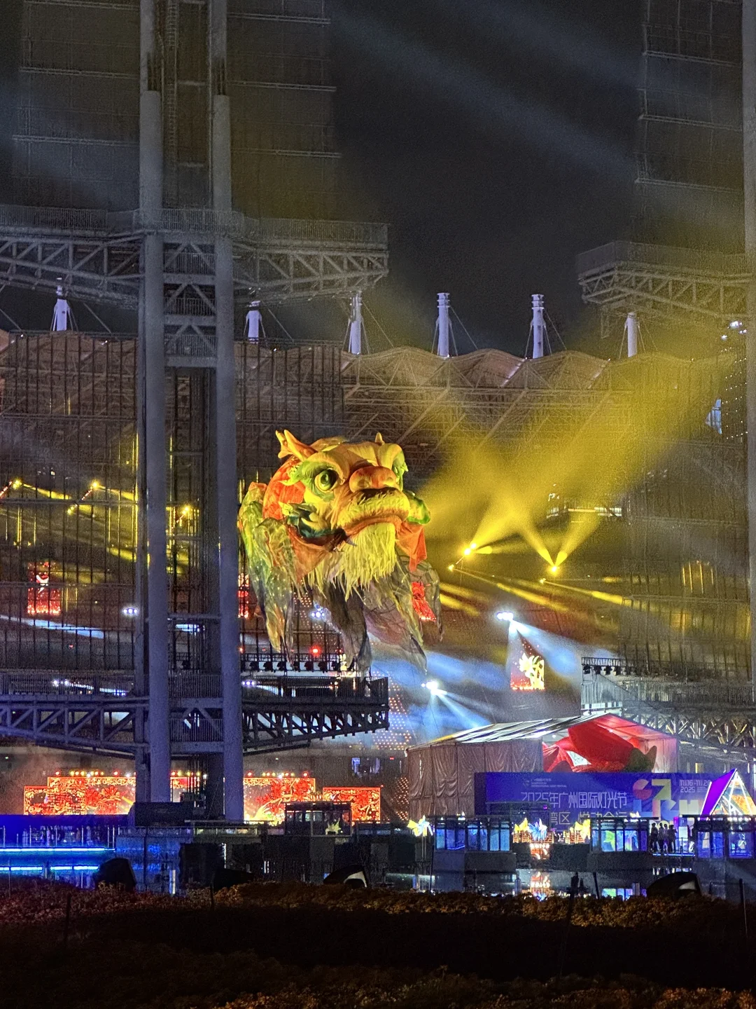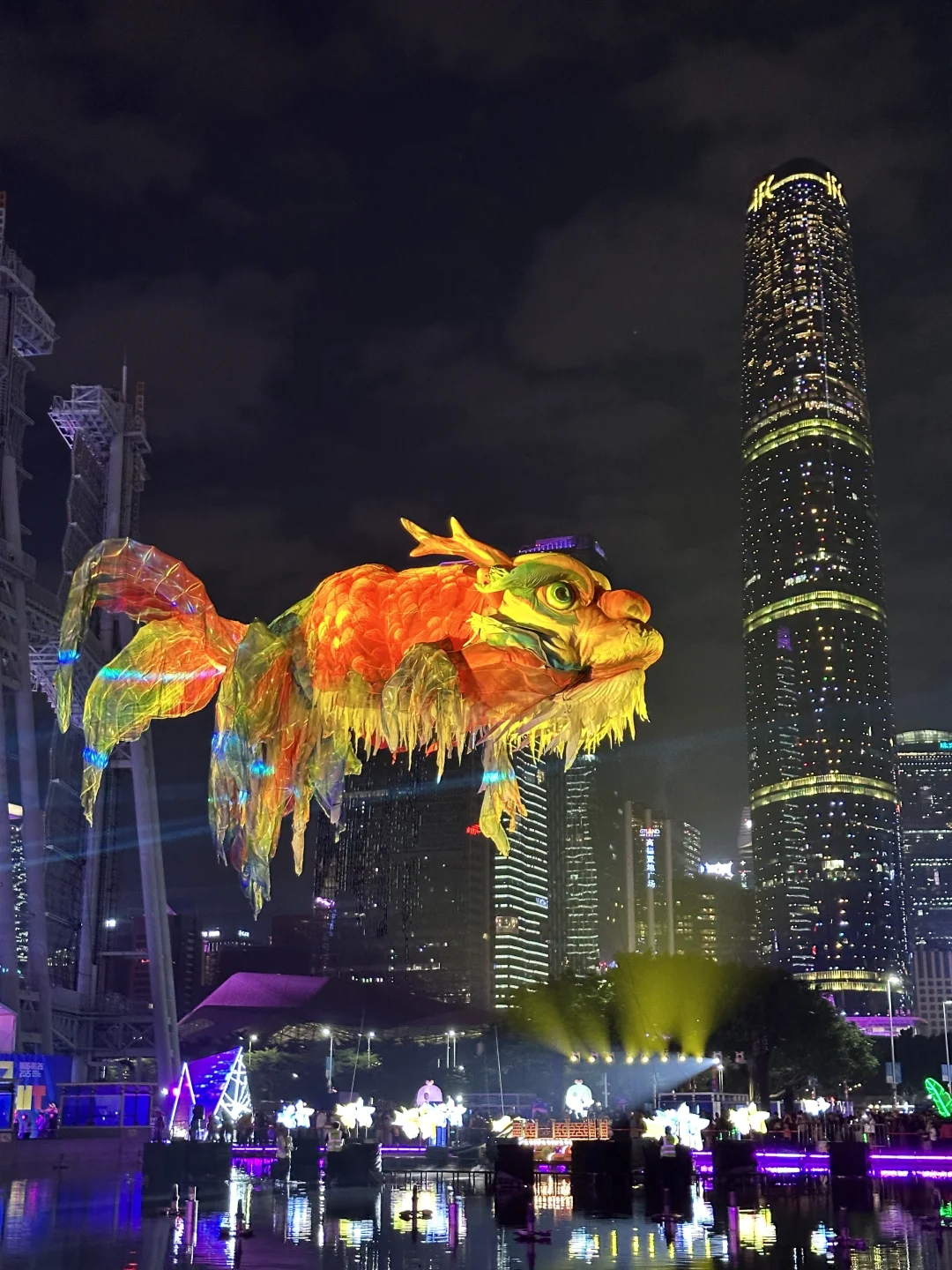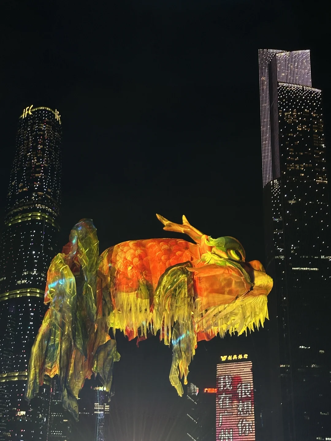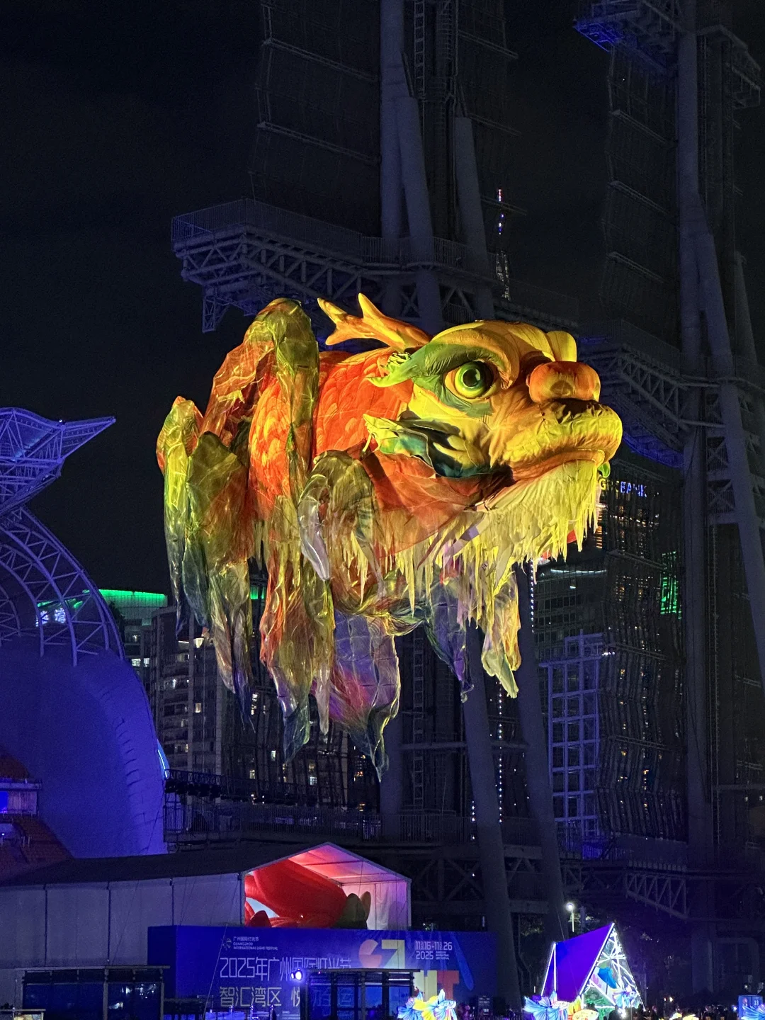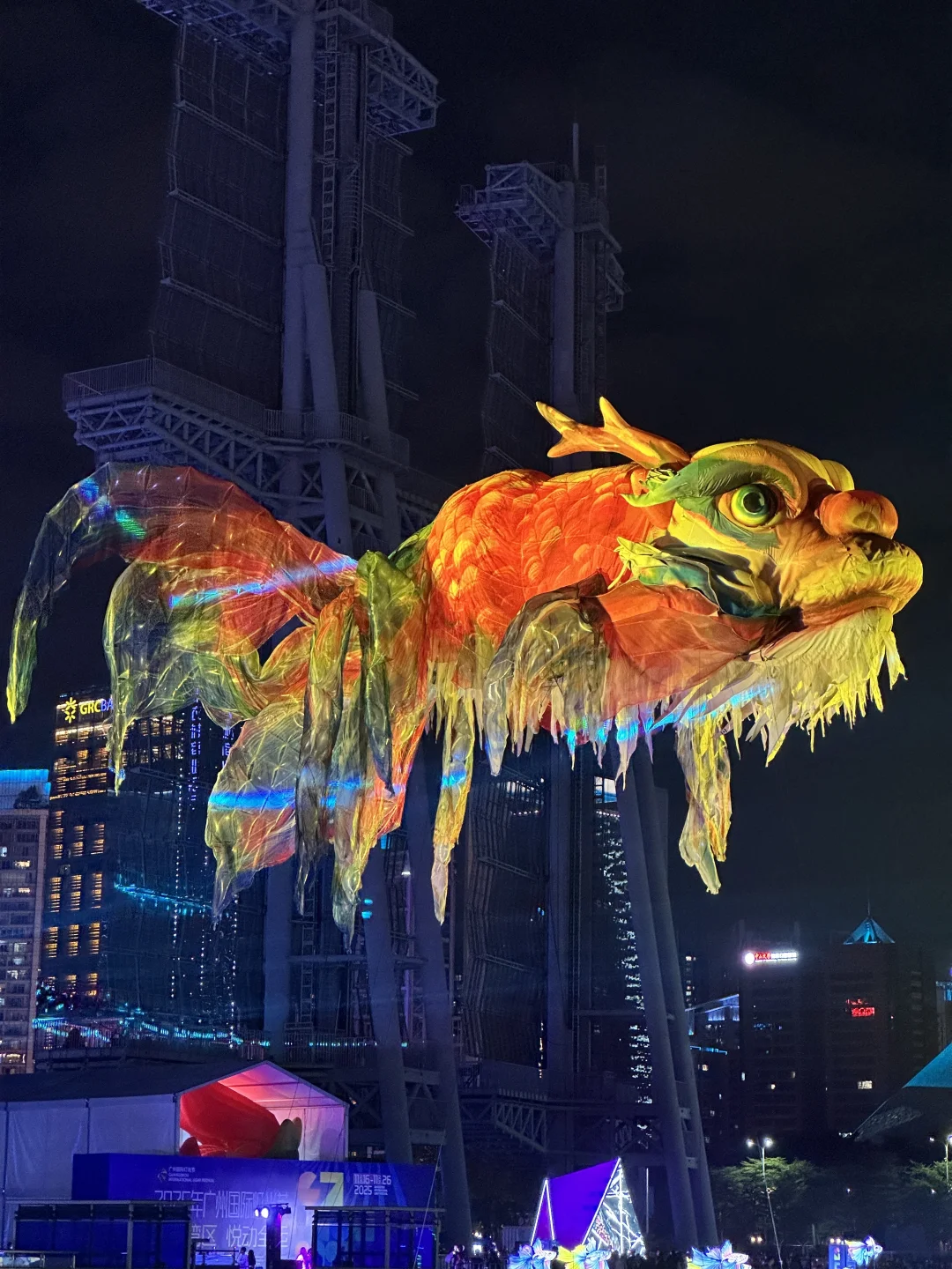 穿过泡泡雨区域,顺着指示牌往里走,远远就看到悬挂在半空的全运会吉祥物鳌鱼!比网上看到的更震撼,通体亮着暖金灯光,偶尔会缓缓震动侧翼和尾翼,像在夜空里游动,细节满满到离谱。