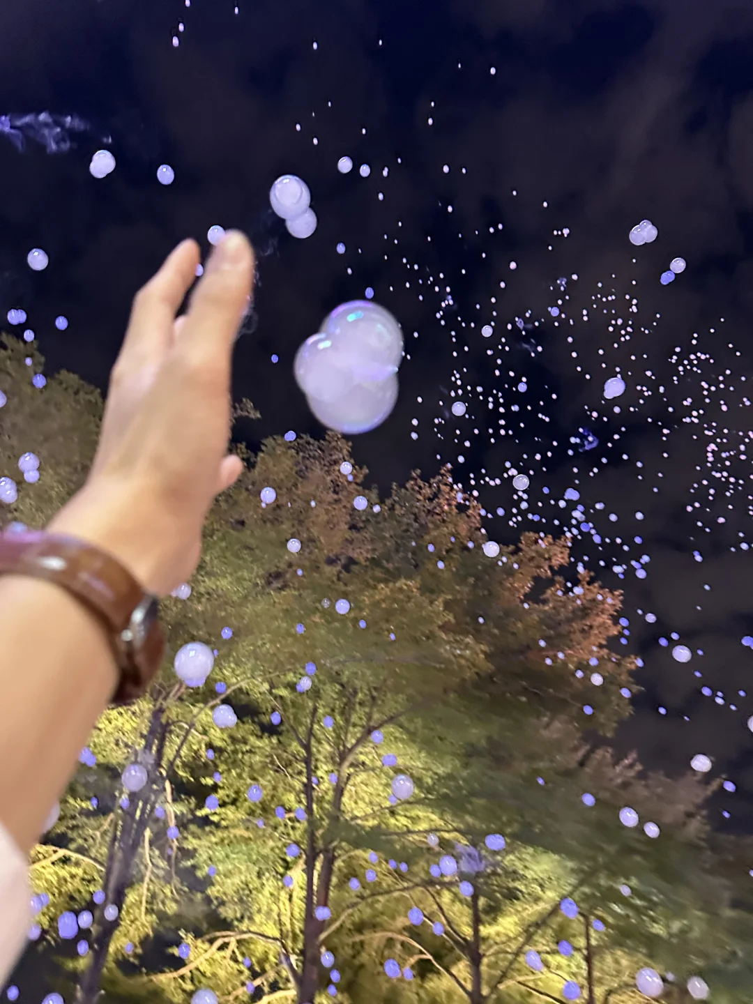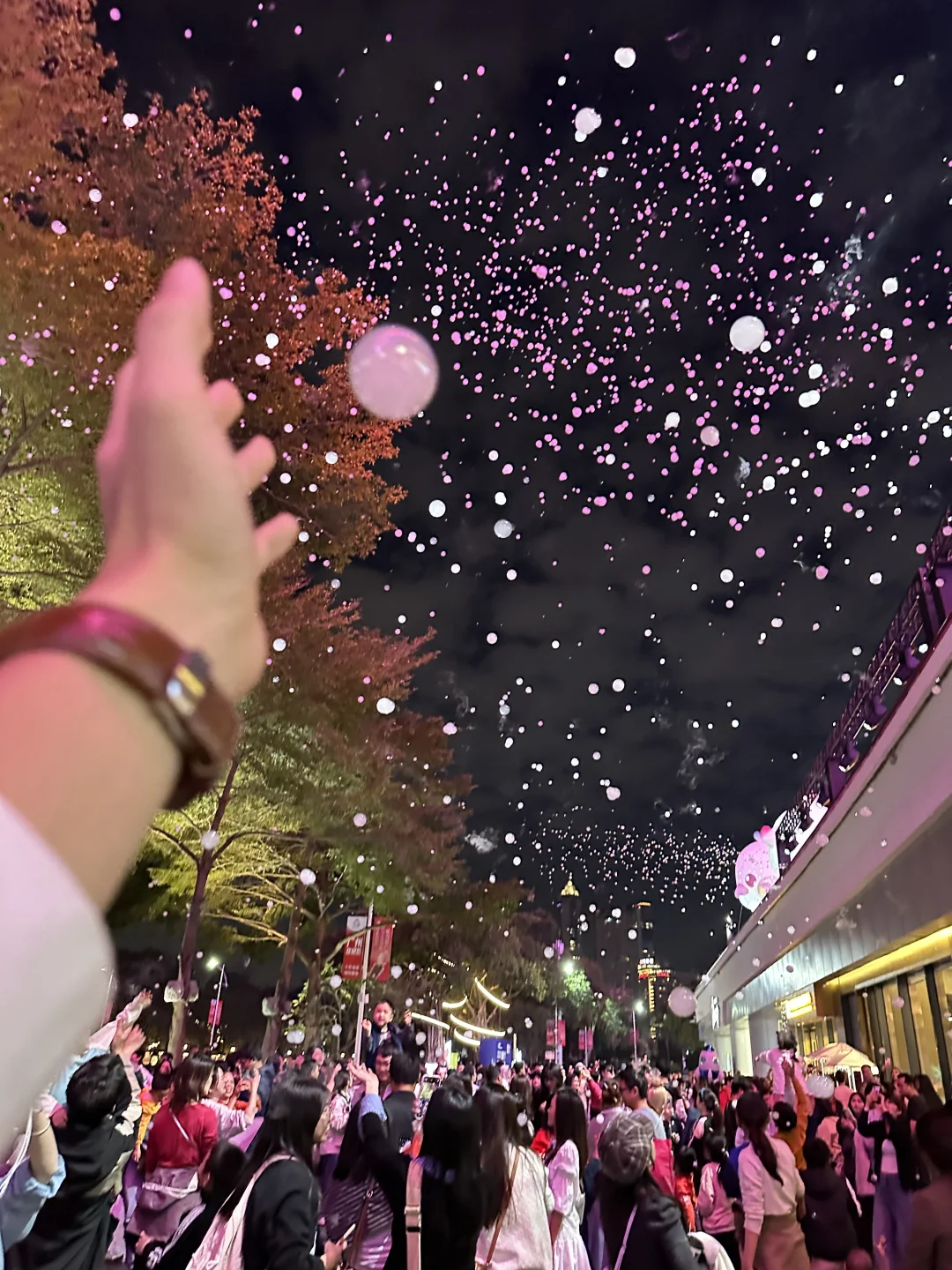 拍泡泡雨一定要开手机连拍(划重点!),泡泡转瞬即逝,连拍能抓下“泡泡漫天+灯光映衬”的绝美瞬间。