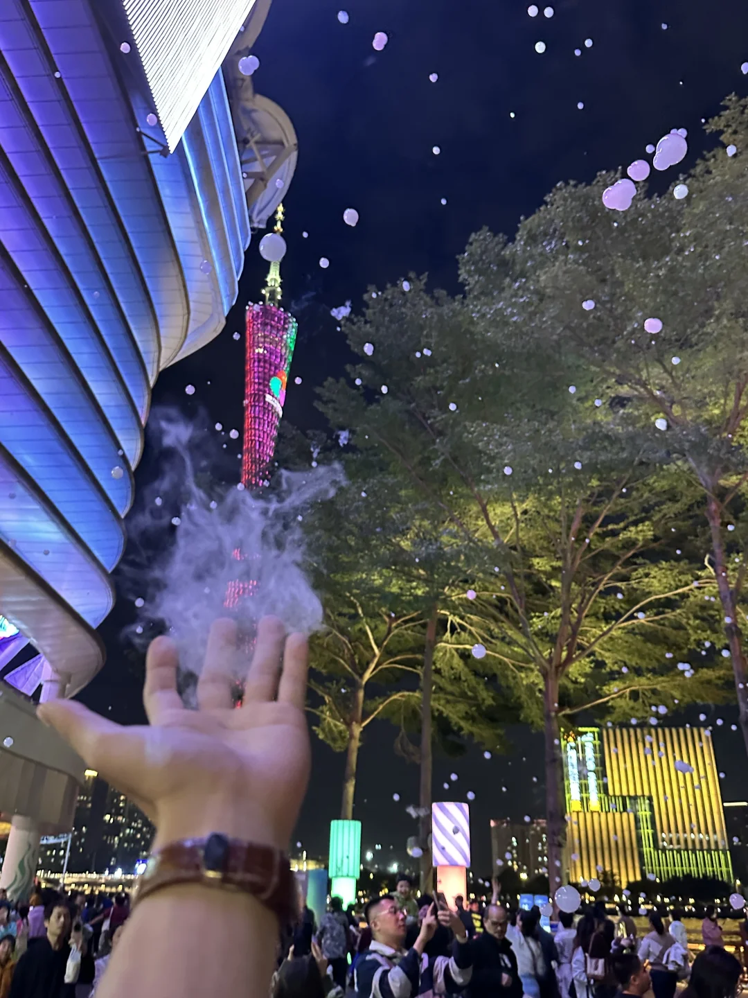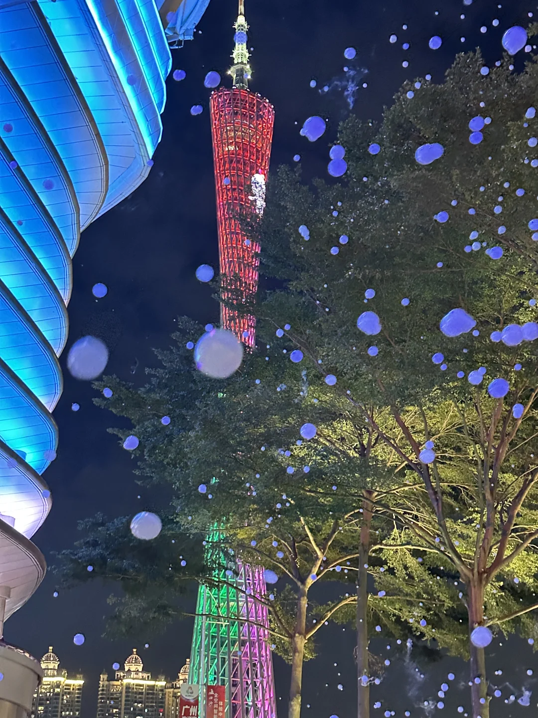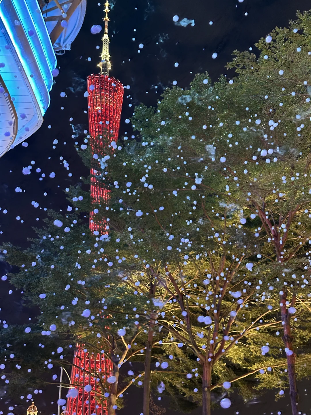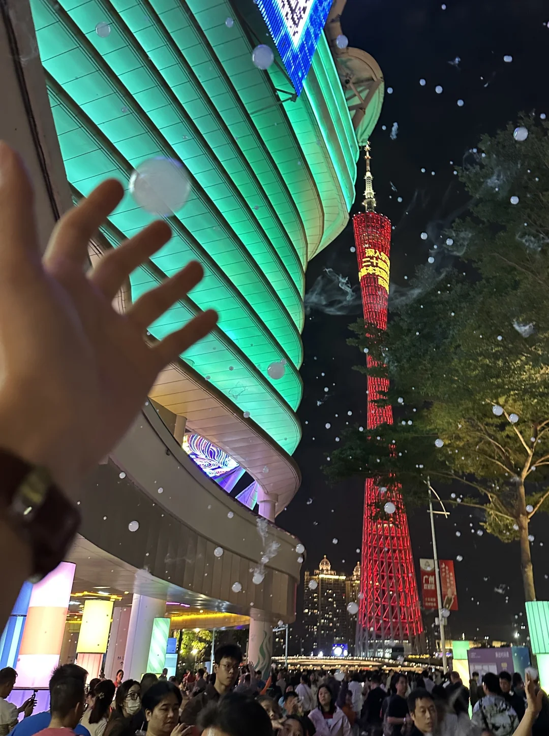 先上超实用攻略:提前3天在“广州灯光节”官方渠道预约,凭预约码从海心沙3号桥检票进入,建议19:30前到,刚好能赶上19:45的泡泡雨,不用跑断腿赶场~ 我踩着点到的,检票超顺畅,跟着指示牌走5分钟就到核心区,一路都是氛围感灯光,还没等泡泡雨开始就拍了好多张!