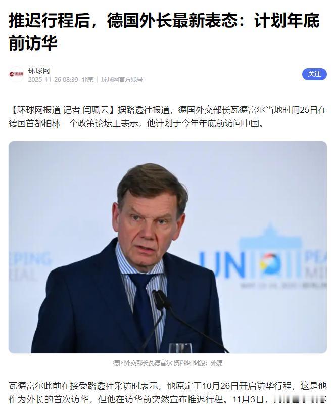 反转来得猝不及防!10月刚因台海问题、稀土议题摆硬姿态临时取消访华的德国外长瓦德富尔,如今竟明确12月第二周前完成访华“最后协调”,笃定今年年底前必成行! 短短两个月的急转直下,藏着德国为默茨明年访华铺路的现实需求,更暴露了其既离不开中国市场、又想端大国架子的深层纠结,这场迟来的访问从一开始就悬念拉满。 其实大国相处,合作从来都不是单一层面的事儿,德国外长瓦德富尔忙着给年底访华做“最后协调”,这背后藏的可不止是双边贸易那点算盘,而是全球治理里的务实考量。 毕竟现在的中德关系,早就超出了简单的买卖往来,已经延伸到了第三方合作、全球公共产品供给这些更深的领域。 很多人可能没注意,中德早就联手在第三国搞起了实打实的合作。德国联邦经济合作与发展部和中国商务部一起搞的中德可持续发展中心(CSD),都运行好几年了,光正式启动的三方合作项目就有四个。 比如在老挝,中德联手帮当地搞职业教育,让老挝的职教老师来中国学实践技能,回去提升农村就业。 在埃塞俄比亚,还一起规范当地纺织业的环境和劳工标准,这些项目不光帮了当地,也让中德企业找到了新的合作空间。 瓦德富尔这趟访华,大概率要聊这些三方合作的深化,毕竟德国企业在非洲、东南亚的布局,离了中国的产业链和当地的市场需求,很难成气候。 德国政府其实心里门儿清,跟中国既不能彻底闹僵,也不能毫无底线妥协。他们最新的中国战略里写得明明白白,把中国当成“合作伙伴、竞争者、制度性对手”,但核心是“拒绝脱钩,只搞去风险”。 这话听着矛盾,其实是务实,德国既想在气候、生物多样性这些全球议题上跟中国合作,又怕在制度和安全上被“带偏”。 就像欧盟之前推的“供应链法”,要求企业审计全球供应商,德国直接就弃权了,因为他们自己早就有类似法律,知道这会给企业添多大负担。 真要是硬推,受损的还是德国的化工、机械这些出口型企业。这种“不跟欧盟硬绑”的态度,其实就是给对华合作留了余地。 而且德国也离不开中国在全球公共产品上的配合。他们的战略文件里直言,中国是最大的碳排放国,也是最大的可再生能源生产国,没有中国,气候危机根本解决不了。 现在全球都在推进2030年可持续发展议程,中德在这方面的协同早就落地了,一起搞学术研究,培养青年人才,还联合举办可持续发展论坛,这些都不是虚的。 瓦德富尔之前也说过,欧洲在气候保护上没中国不行,这话其实是大实话,毕竟光靠德国自己,既没足够的产业链支撑,也没那么大的市场体量。 当然,德国对华政策也有纠结的地方。战略文件里一边说要加强公民社会交流,一边又抱怨“接触中国公民社会的障碍增多”。 一边想在第三国合作中赚钱,一边又担心中国的制度影响。但这种纠结最终还是要让位于务实,就像欧盟供应链法受阻那样,德国不会为了所谓的“制度对立”,让自己的企业吃亏。 中德之间的制度差异确实存在,但这些差异不该成为合作的绊脚石,就像王毅外长强调的,别搞“麦克风外交”,坐下来沟通才是正道。 瓦德富尔这趟访华能不能成,成了之后能谈出啥,关键看德国能不能放下身段。 三方合作是个好抓手,既能发挥德国的技术优势,又能借助中国的产业链和市场资源,还能帮第三国发展,是三赢的事儿。 而且在气候、生物多样性这些全球议题上,中德联手能带动更多国家参与,这才是大国该有的担当。 说到底,现在的世界不是零和博弈的舞台,中德作为全球重要经济体,合作的意义早就超出了双边范畴。 瓦德富尔的访华,与其说是“修补关系”,不如说是“校准方向”,把合作从单纯的贸易往来,拓展到全球可持续发展的更广阔领域。 只要双方都抱着务实的心态,尊重彼此的核心利益,不光能让两国企业受益,还能给动荡的世界注入稳定的能量,这才是大国合作该有的样子。