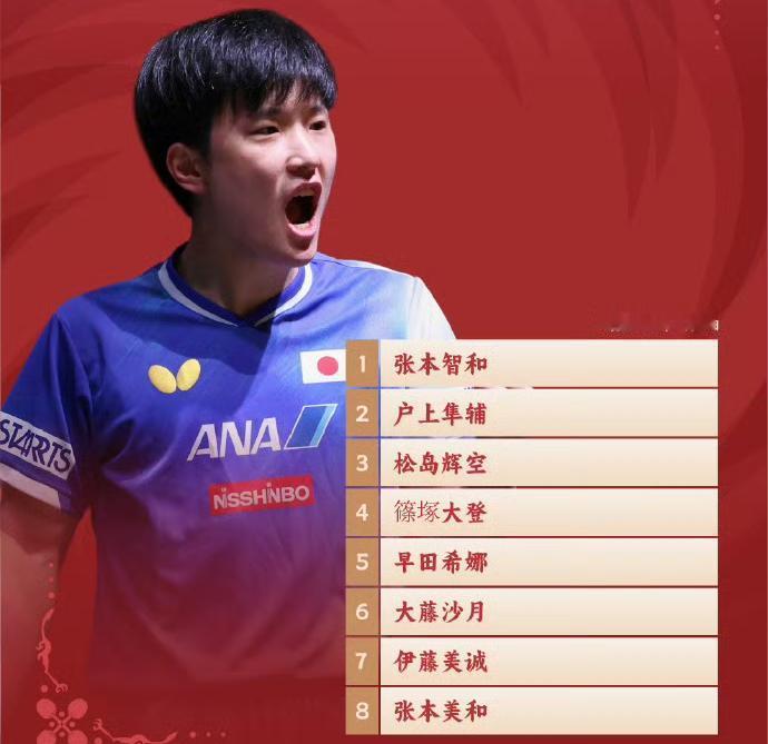国乒夺冠最大的对手 日本参加成都乒乓球混合团体世界杯阵容! 男子: 张本智和、户上隼辅、松岛辉空、篠塚大登 女子: 张本美和、早田希娜、伊藤美诚、大藤沙月