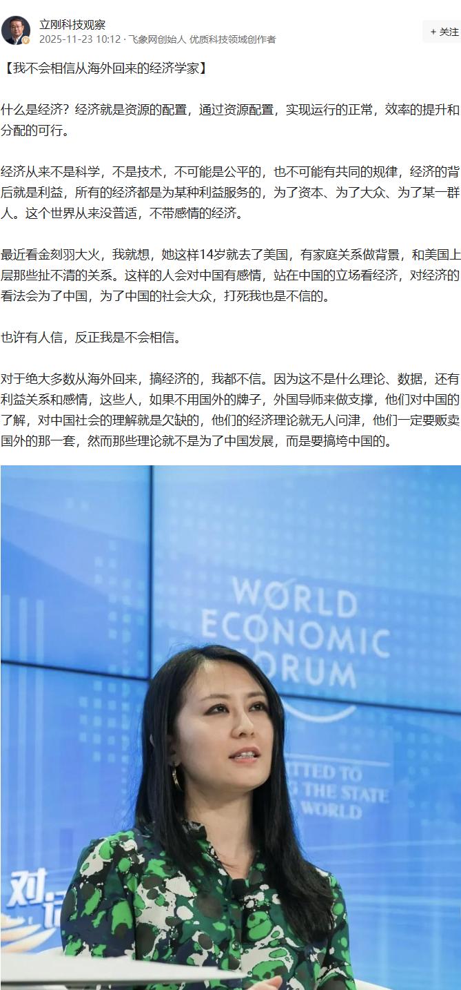 海归金刻羽火了,项立刚对金刻羽的点评更是一语道破! 海归金刻羽对中国经济指点江山,项立刚一句评价把海归经济学家的高大上击的粉碎! 项立刚的观点非常直接,他认为一些海归学者从西方导师那里学来的那套理论,根本不是为了帮助中国发展,而是想把中国引向一个被设计好的、符合西方利益的轨道。 很多海归学者捧着西方导师的理论当圣经,可这些理论从根上就不是为中国量身定做的。西方的经济学、社会学理论,大多是基于他们自己的历史背景和发展阶段攒出来的,比如那些鼓吹“政府彻底退出市场”的自由经济说法,本就是为资本主义扩张服务的,可他们硬要套在中国身上。 要知道中国是超大规模经济体,又是社会主义市场经济,政府在统筹资源、推动产业升级这些事上的作用,是西方理论里压根没算明白的变量。 就像之前有人照搬西方的“反垄断”逻辑,对着中国的互联网平台喊打喊杀,却忘了这些平台在下沉市场、数字普惠里的价值,这根本不是帮中国解决问题,而是按西方的尺子裁剪中国的发展。 而且这些“洋理论”很多自带西方的利益预设。当年西方搞现代化理论,表面上是教发展中国家怎么变强,实际上是把美国的发展模式当成唯一标准答案,逼着其他国家往这个模子里钻。现在有些海归学者讲的那套,换汤不换药,嘴上说的是“国际通行规则”,其实是让中国放弃自己的产业政策,放弃对关键领域的把控,好让西方企业能无阻碍地进来捞好处。 项立刚说的没错,这是基于中国的国情提出建议帮中国发展嘛,分明是给西方铺路。 有些人大谈“金融完全开放”,却不提东南亚国家当年跟着这套理论走,结果被国际资本割了韭菜的教训,这背后的心思可不简单。 中国的发展早就证明,解决自己的问题得靠“土办法”加“巧借鉴”,绝不是靠“洋理论”照本宣科。改革开放这些年,不管是脱贫攻坚还是新能源产业崛起,都是靠着立足中国国情,一点点试出来、闯出来的,而不是靠哪个西方导师的理论指导出来的。 西方理论里总把政府当成市场的对立面,可中国的发展恰恰是政府和市场配合着来的——政府搭平台、补短板,市场搞创新、活效率,这种模式是西方理论解释不了的,却实实在在让中国富了起来。 那些把“洋理论”吹成万能钥匙的人,要么是没搞懂中国的实际,要么就是故意忽略中国的特殊性,一门心思要把中国往西方设计好的套路上引。 说到底,项立刚的点评点透了本质:不是说西方理论一点用没有,而是不能把它当成圣旨。中国的问题得用中国的办法解决,那些听起来高深的“洋理论”,要是脱离了中国的国情和利益,再好听也只是幌子,根本成不了什么万能钥匙。