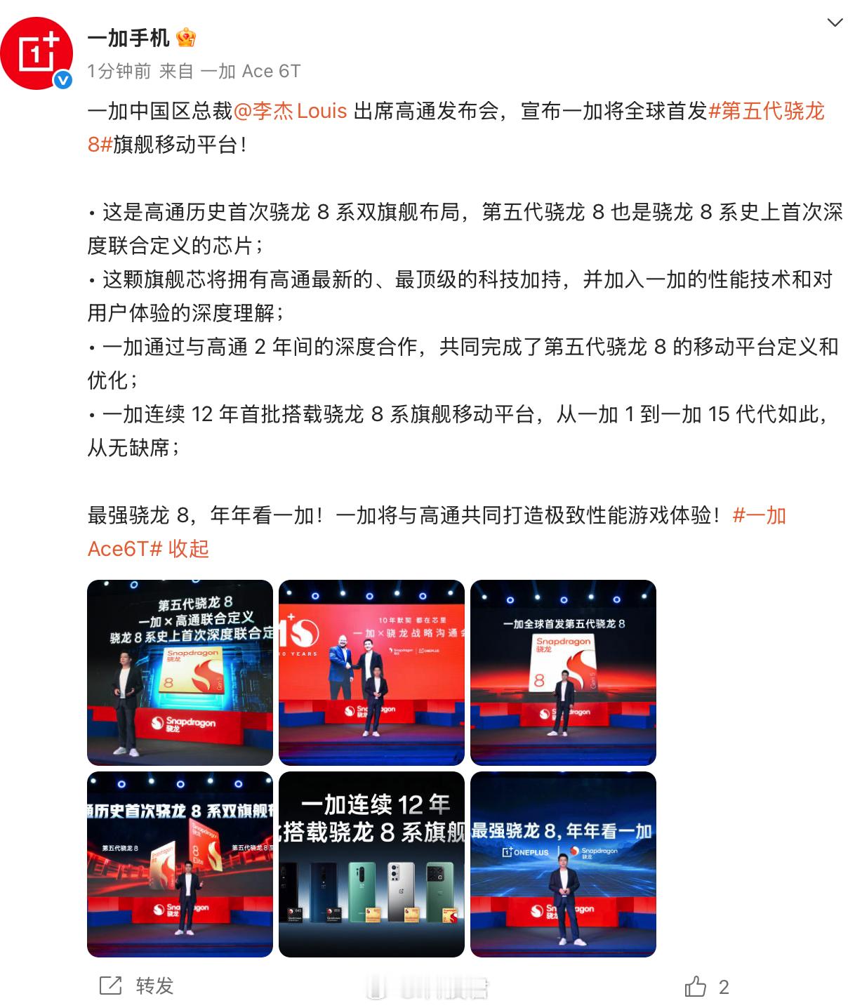 一加将全球首发第五代骁龙8旗舰移动平台!一加Ace 6T即将发布