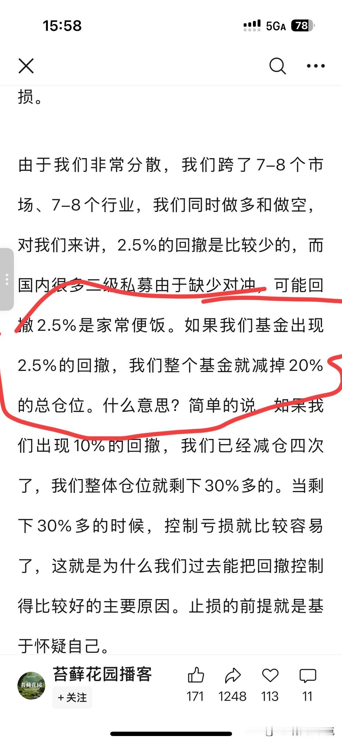 65亿美元规模的私募基金,居然是回撤2.5%就要减掉20%的总仓位。这个原则和操作策略也是醉了。不过人家能保持13年间,只有⼀年亏损(-4.8%),最大历史回撤只有6.5%,费前年化复合回报约20%(费后约14%),现今规模约65亿美金。团队中基金经理/分析师人数约20人。 只能说,厉害。私募女魔头应该出来说几句。