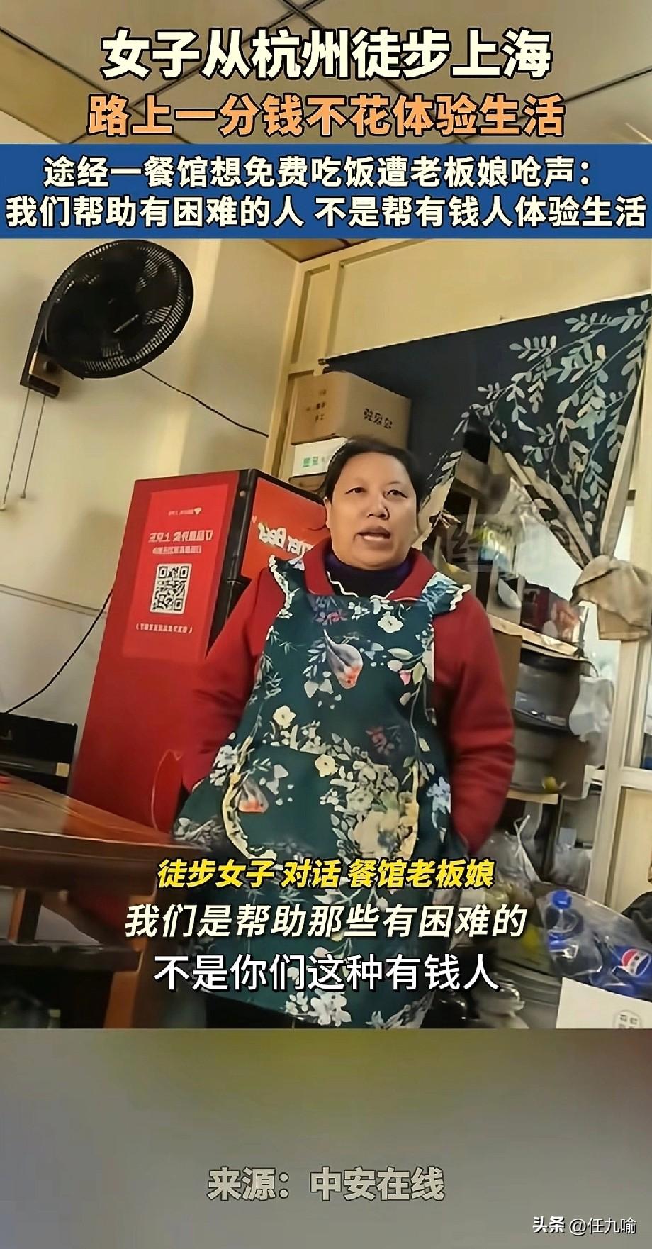 “怼得太解气!”杭州,女子打算一分钱不花徒步到上海,走进一家餐馆就想白吃白喝,还美其名曰体验生活,结果被老板娘怼到哑口无言。 女子出发后,先在街上跟路人求助,说自己要不花费徒步,想让别人帮忙解决吃喝住,结果被路人直接拒绝。 之后她进了一家饭店,想免费吃顿饭,还跟老板娘解释不是舍不得花钱,就是想体验生活,没想到被老板娘当场怒怼:“我们帮的是真有困难的人,不是你们这些连饭钱都舍不得给的有钱人”。女子最后只能尴尬地走了。 女子打扮得很整齐,手上还做着精致美甲,举着手机拍视频记录,明明有钱吃饭,却打着体验生活的旗号,理直气壮向陌生人要免费餐食。还好老板娘很清醒,一眼就看穿了本质。 真正的生活体验,应该是靠劳动换饭吃。比如帮餐馆洗洗碗换顿饭,或者临时打个工赚点路费,而不是心安理得地向陌生人索取,把别人的善心当成“白嫖”的资本。 老板娘的拒绝,不光是保护自己的小本生意,更是守住了社会善意的底线,善心是留给那些突遇难处、走投无路的人的,不是让有闲有钱的人拿来消遣、博眼球的。 体验生活没问题,但应该是靠双手创造价值,尊重他人的劳动,让善意永远留给真正需要的人。