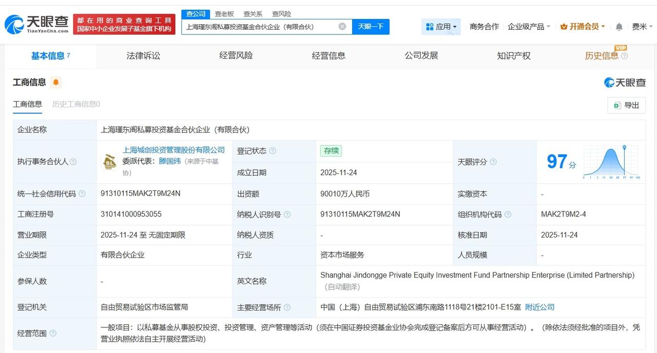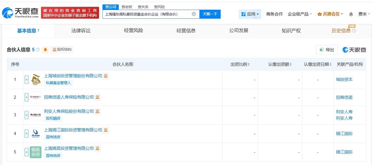 招商信诺、利安人寿等在上海成立私募投资基金出资额约9亿 天眼查工商信息显示,近日,上海瑾东阁私募投资基金合伙企业(有限合伙)成立,出资额约9亿人民币,经营范围为以私募基金从事股权投资、投资管理、资产管理等活动。合伙人信息显示,该基金由上海城创投资管理股份有限公司、招商信诺人寿保险有限公司、利安人寿保险股份有限公司、上海锦江国际投资管理有限公司、上海锦荔投资管理有限公司共同出资。 天眼查信息: