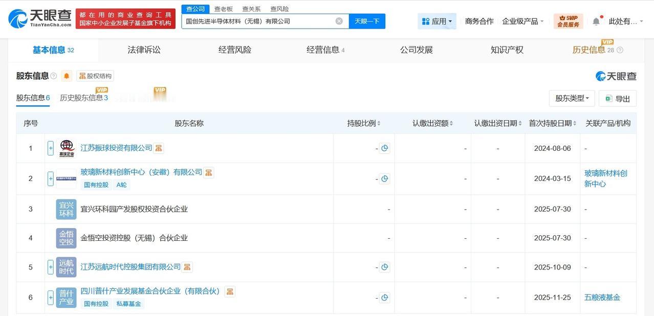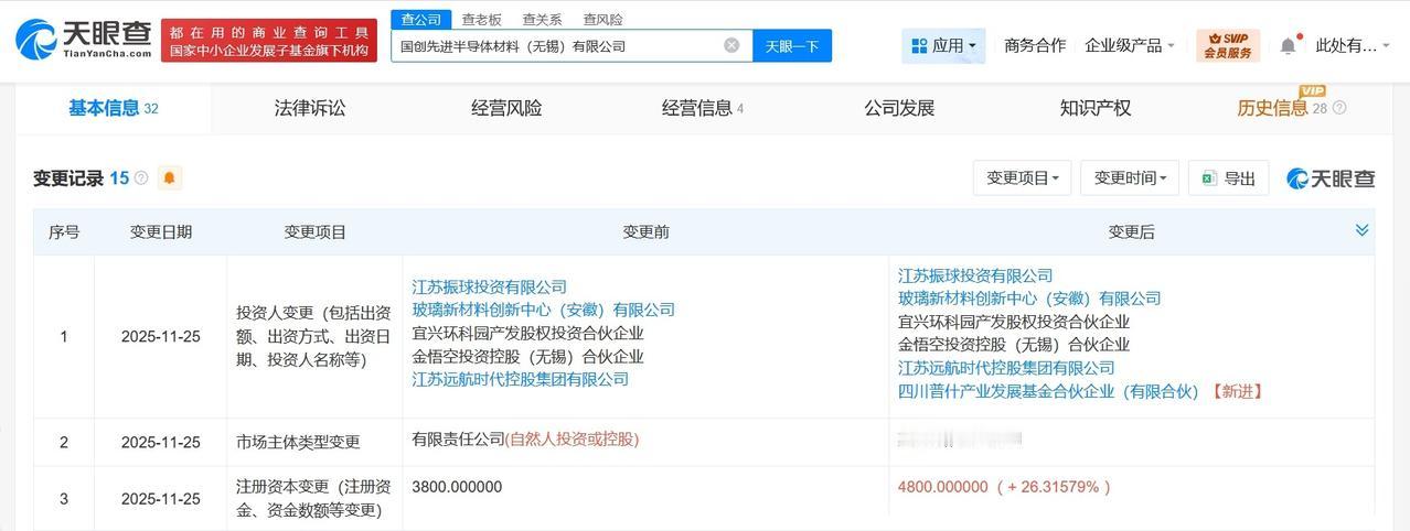 五粮液旗下基金入股国创先进半导体后者增资至4800万 天眼查App显示,近日,国创先进半导体材料(无锡)有限公司发生工商变更,新增五粮液旗下四川普什产业发展基金合伙企业(有限合伙)为股东,注册资本由3800万人民币增至4800万人民币。 国创先进半导体材料(无锡)有限公司成立于2024年3月,法定代表人为郑际杰,经营范围含工程和技术研究和试验发展、技术玻璃制品制造、技术玻璃制品销售、新材料技术推广服务、新材料技术研发、技术进出口等。股东信息显示,该公司现由江苏远航时代控股集团有限公司、玻璃新材料创新中心(安徽)有限公司、江苏振球投资有限公司及上述新增股东等共同持股。 天眼查信息: