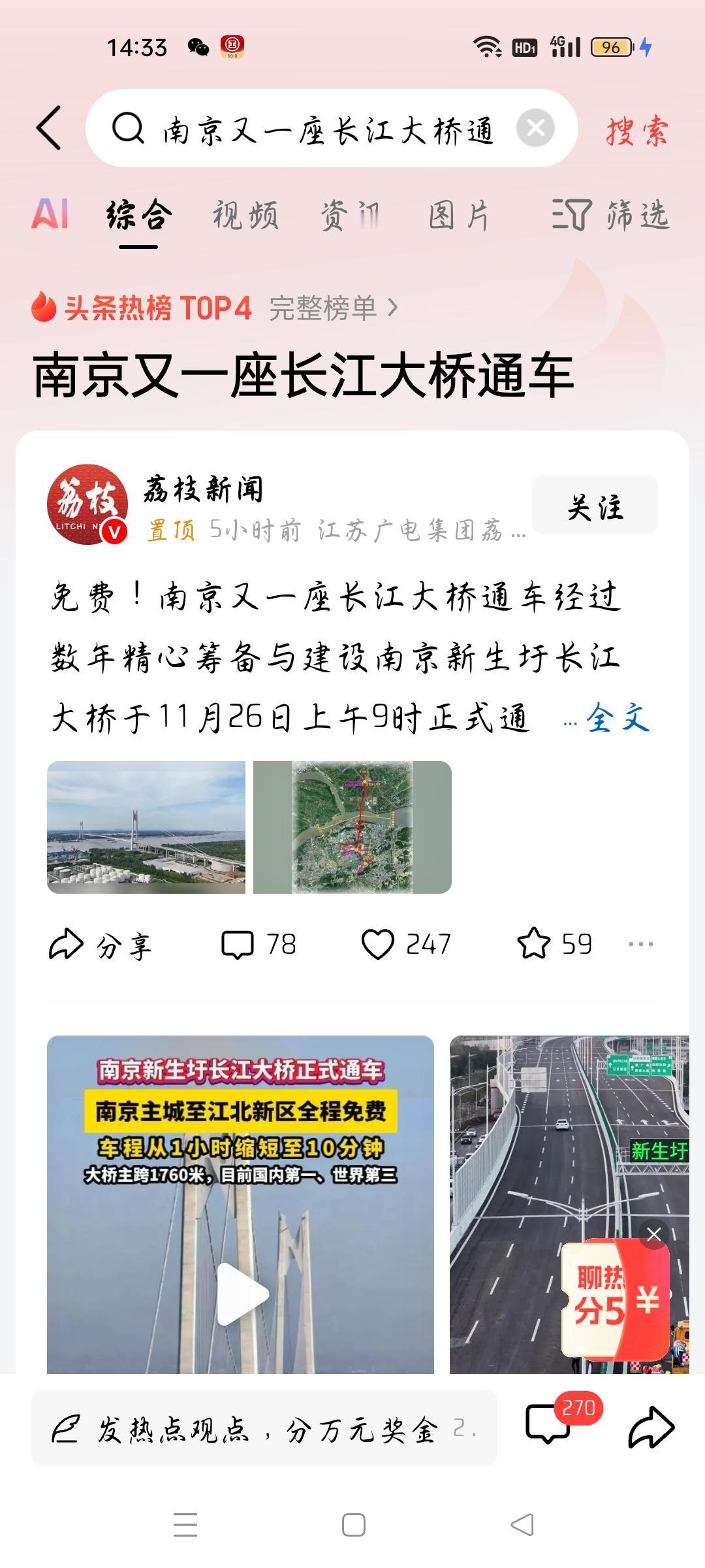 南京又一座长江大桥通车,我想说 据荔枝新闻报道,南京又一座长江大桥一南京新生圩长江大桥于2025年11月26日九时正式通车,这座大桥,是南京主城区通向江北新区的重要枢纽,其中跨江主桥为单跨吊钢箱梁悬索桥,主跨达1760米,建成后即成为“中国第一,世界第三",全程免费,车程从一小时缩短至10分钟。个人认为,南京新生圩长江大桥的通车,为市民提供交通便利,有助于新区的经济发展,必将为南京的发展创造更好的条件。