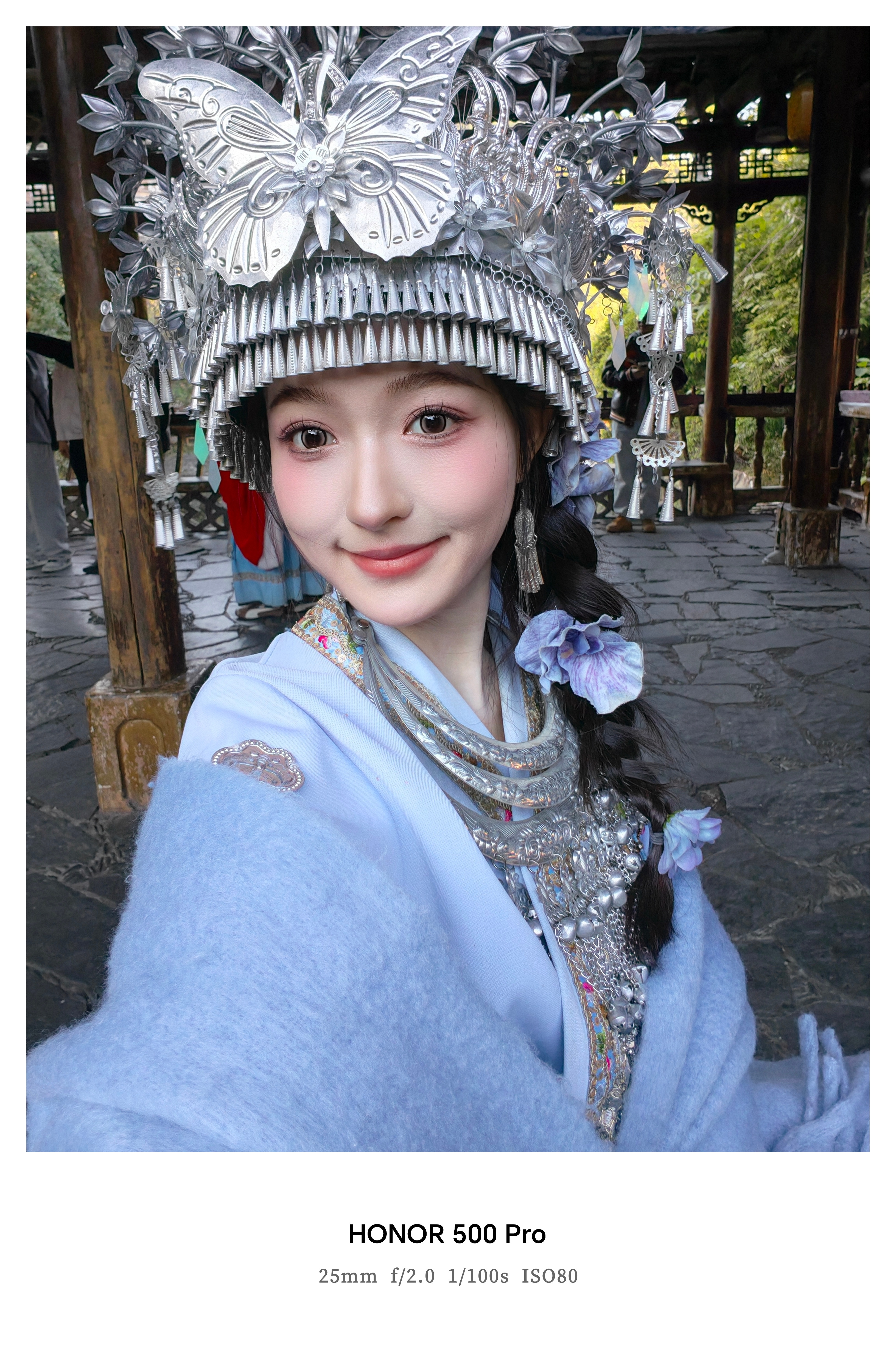 我美吗?小姐姐抢我荣耀500 Pro发的,她想看看大家都怎么夸人自拍好看的~苗族新年美出框