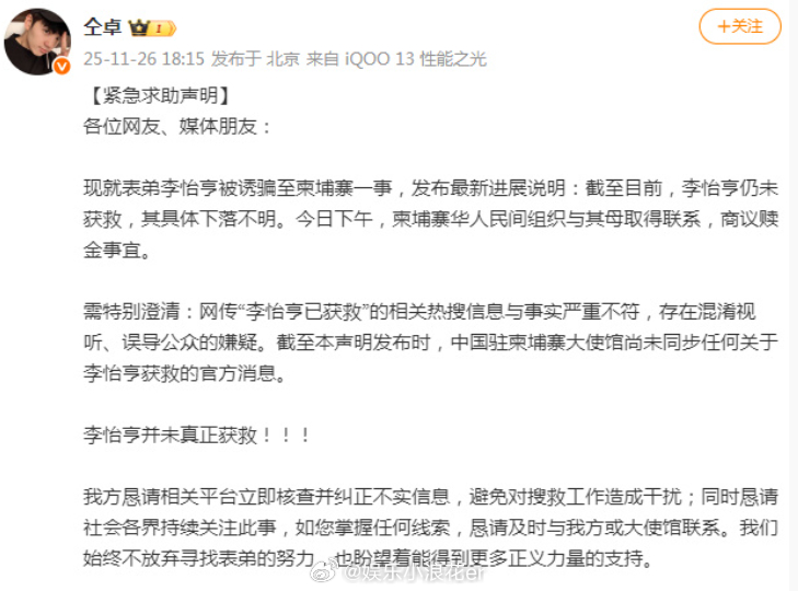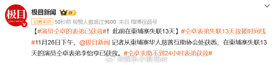 仝卓称表弟未真正获救仝卓发紧急声明,称表弟并未真正获救,但有媒体此前报道称其表