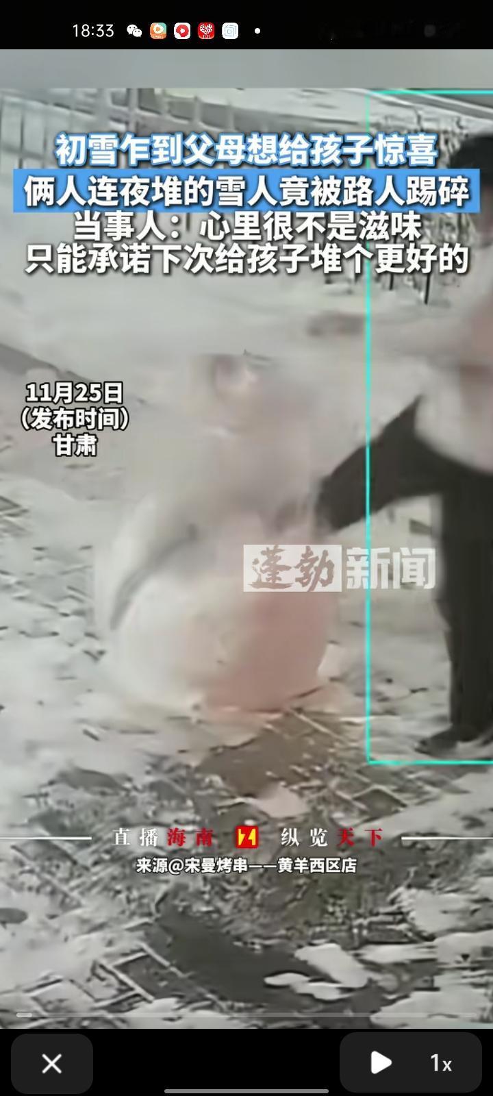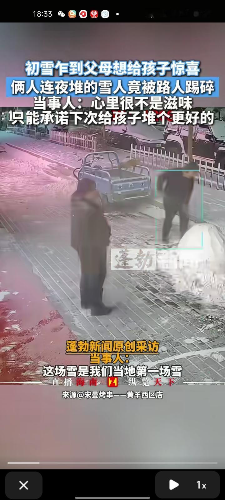 11月24日,甘肃武威。初雪乍到父母想给孩子惊喜,两人在外面连夜堆好雪人,第二天雪人被路人踢碎了,重新做要花费不少功夫。当事人称,看了心里很不是滋味,只能承诺牌下次给孩子堆个更好的