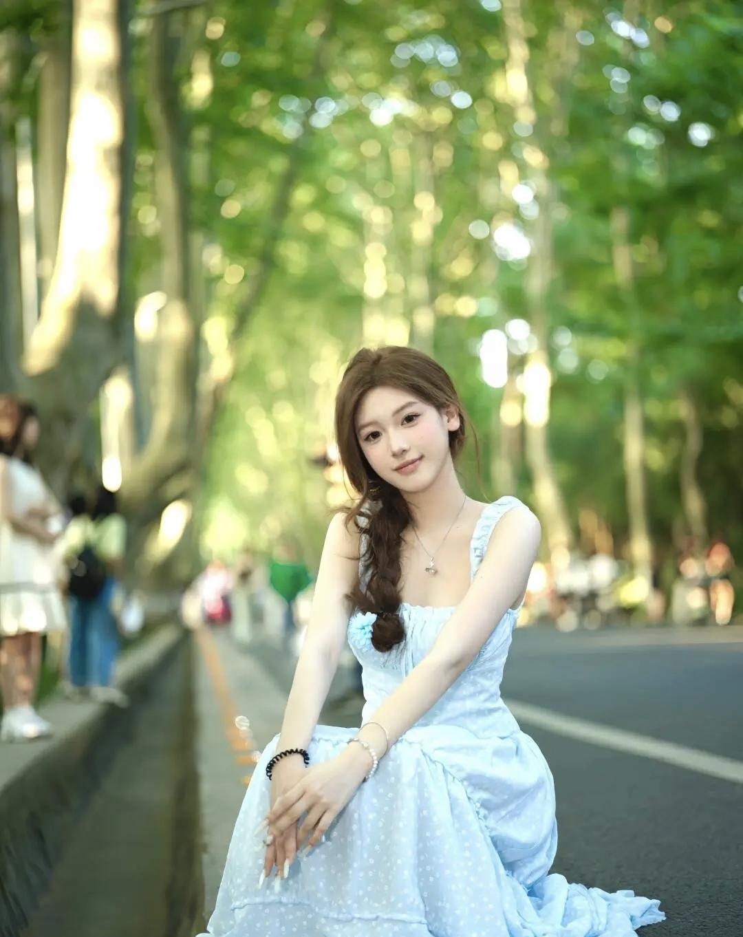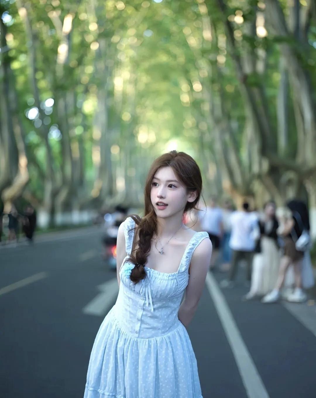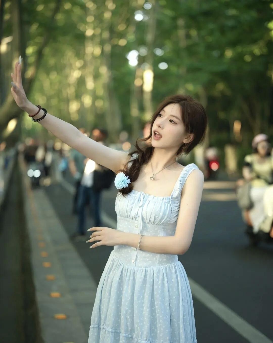 傍晚的风裹着树影的光斑,浅蓝色裙摆晃成夏天最软的云。抬手碰了碰漏下来的阳光,连空气都浸着清甜的香。