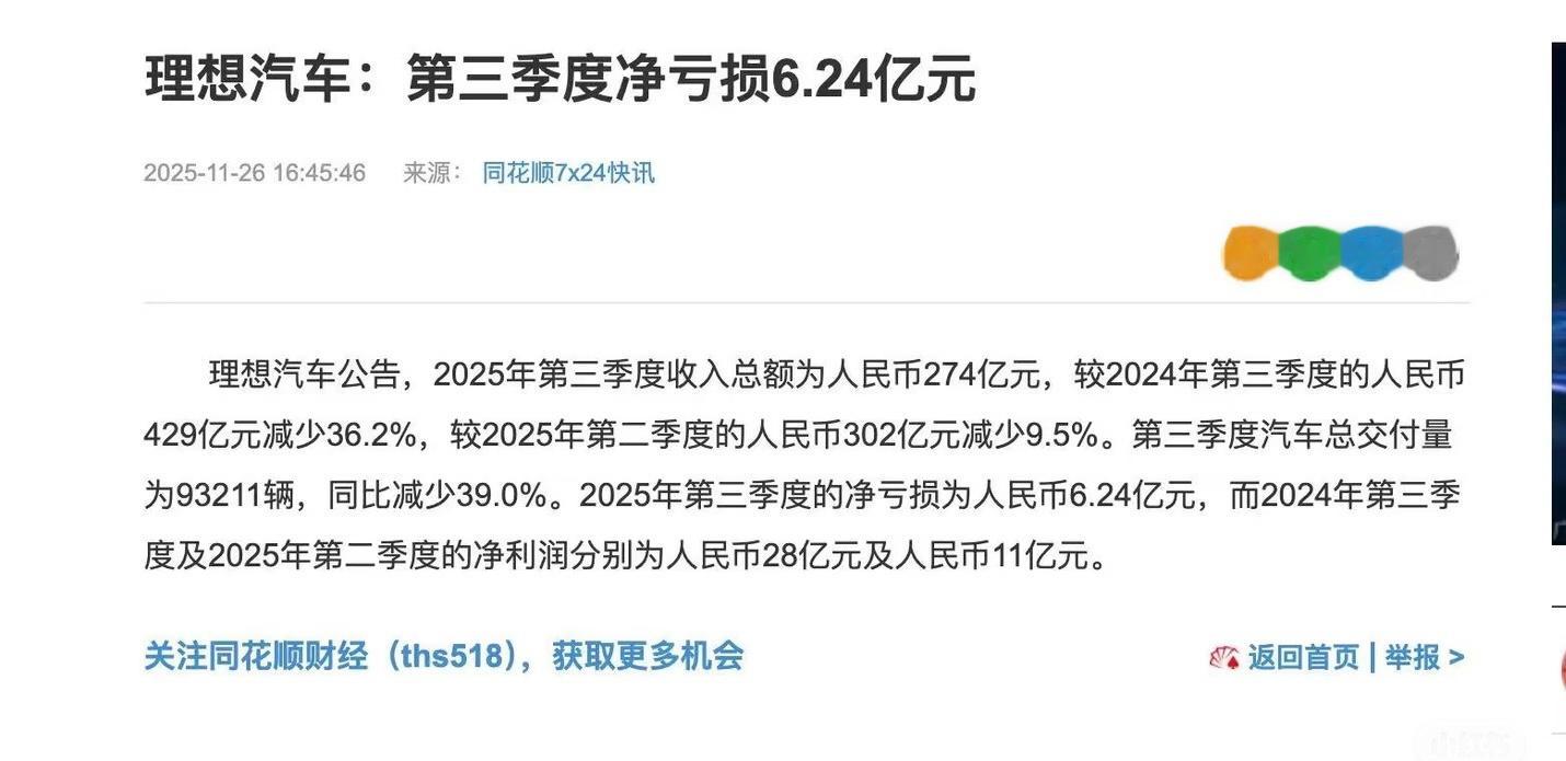 理想汽车25年三季度亏损6.24亿元,营收274亿,同比减少36%理想汽车这几年来顺风顺水,接下来就是考验了