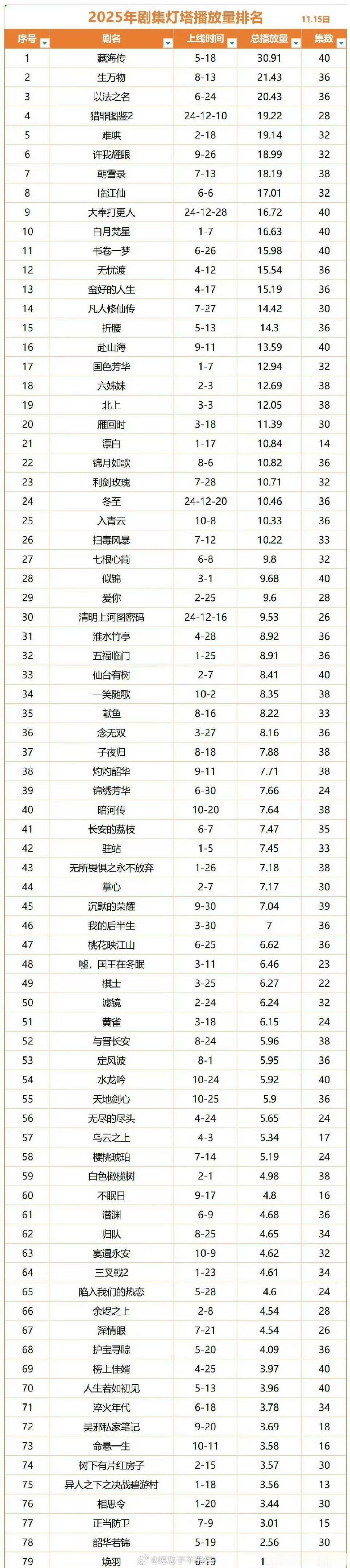 2025年剧集灯塔播放量排名统计: top3:藏海传 生万物 以法之名