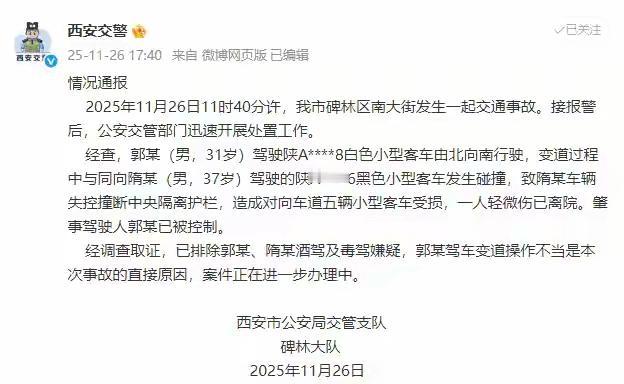 警示!有些人开车就是随心所欲,从来不把交规放在心上,本来沿着一个车道顺序通行对大家都好,可他偏偏要“耍帅”,在车道上变来变去。看看今天发生在西安的这场车祸,一次不当变道完成多大的后果。今天有多位网友发布视频称,11月26日11点40分左右,在西安市碑林区南大街发生一起交通严重事故。从网传视频中可见,事故现场有多车受损,一大段护栏被撞得稀碎,散落在路面上,现场还有被撞碎的汽车碎片及掉落的车轮,可见当时撞击力度之大。据当地警方通报,事故中有1人受伤。肇事司机郭某驾车变道操作不当是本次事故的直接原因,目前郭某已被控制,案件正在进一步办理中。热点 西安今天发生一起严重交通事故 西安南大街交通事故致多车受损