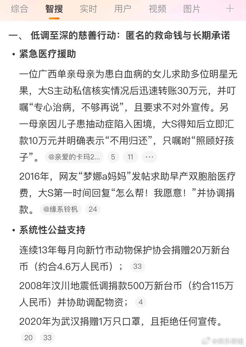 大S你私下到底做了多少好事大S长期低调参与公益。多次匿名捐款帮助困境儿童、白血病患者及受灾群体,曾为一位抽动症患儿母亲转账10万元,私信资助白血病女孩家庭30万元,且要求不要对外宣传。