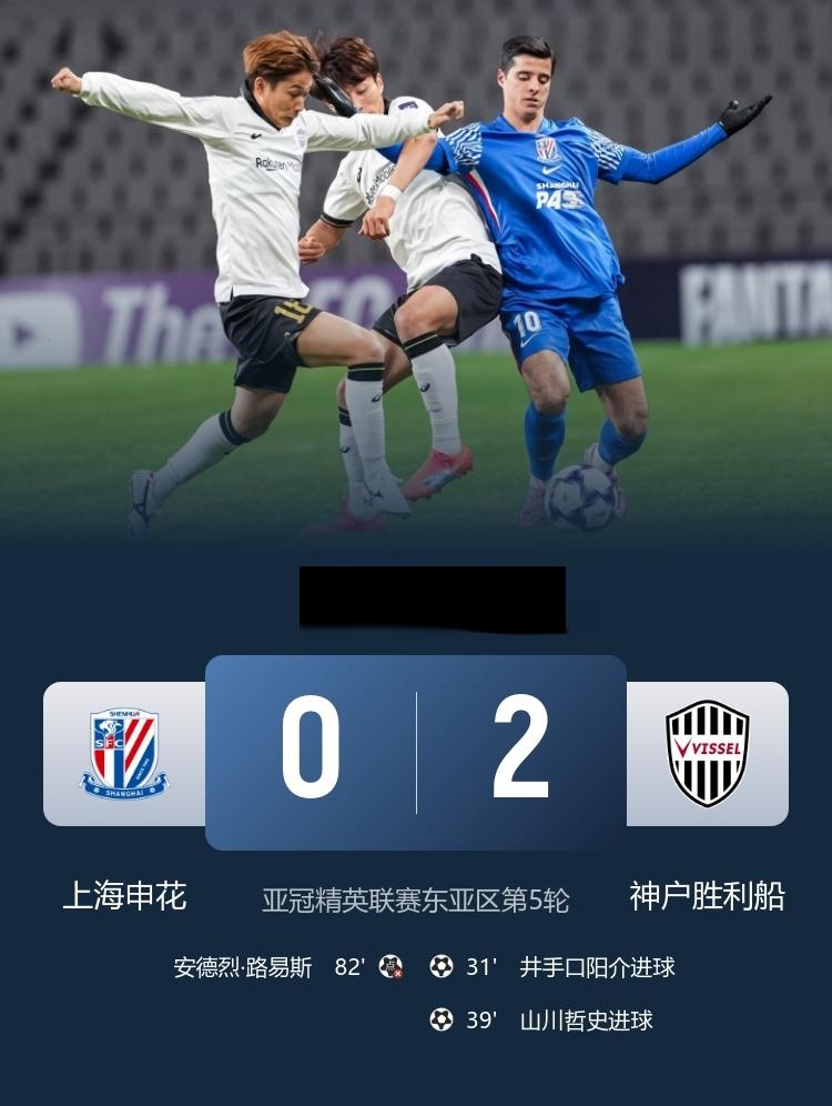 亚冠-申花0-2神户 深陷淘汰区 路易斯失点+进球被吹 11月26日 亚冠第5轮 上海申花坐镇主场迎战神户胜利船。上半场,井手口阳介、山川哲史先后破门。下半场,路易斯失点,米内罗进球被吹。最终,申花0-2不敌神户胜利船,亚冠两连败。积分榜方面,申花4分倒二,神户胜利船12分领跑
