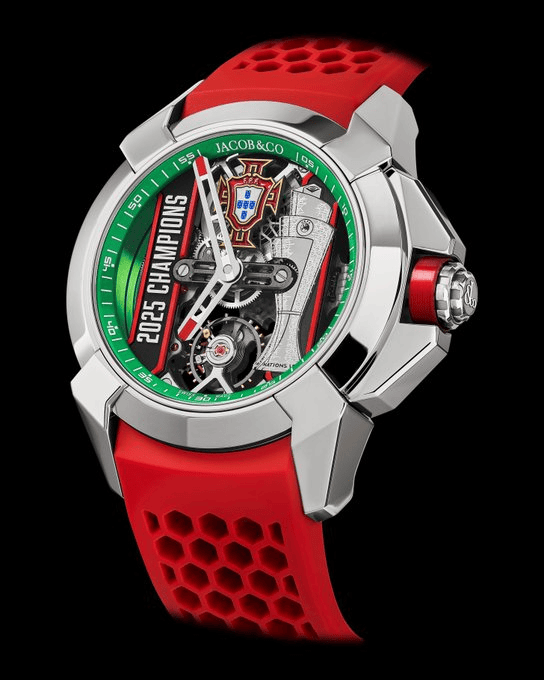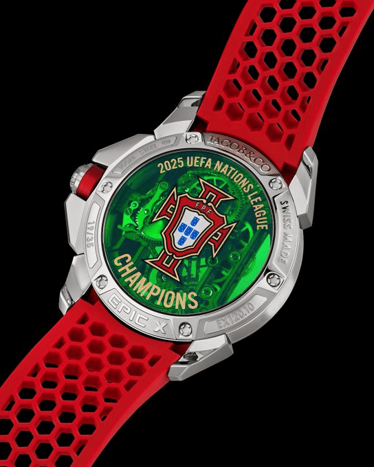 制表商已在社交媒体展示了这款限量35枚的腕表设计:镂空表盘、定制图案与葡萄牙国徽元素交相辉映,正如冠军们一般卓尔不群。雅各布与科公司声明称:"镂空表盘、定制设计与葡萄牙国徽——这款腕表与冠军们同样非凡。"