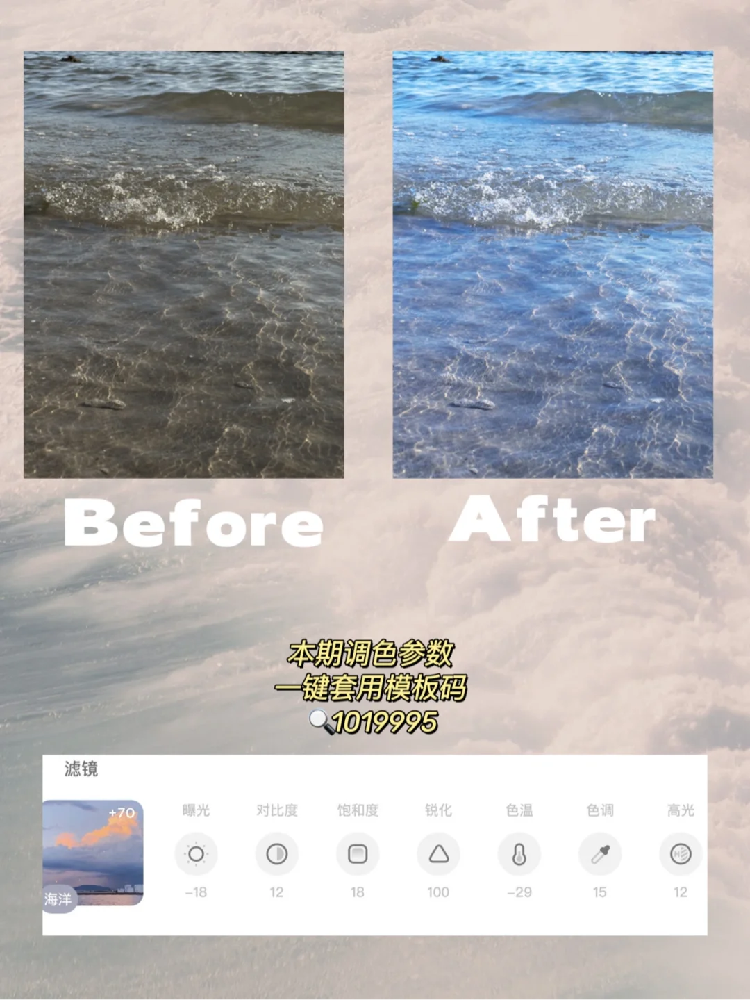✨海边太好拍啦!旅游的时候可以用起来这个滤镜~hin好用! . 💻后期修图教程 🧈黄.油.相.机 📷滤镜:海洋+70 📷曝光-18 📷对比度+12 📷饱和度+18 📷锐化+100 📷色温-29 📷色调+15 📷高光+12 . 模板码:1019995🔍(一键套用) . 调色完成后,到发布页面,点击图片旁边「+」号,可以再次导入图片,就可以一键调色哦!📷 . 手机调色|调色教程|黄油滤镜调色|调色软件 | 滤镜调色教程| 拯救废片 | 手机拍照 | 手机摄影 我们下一期再见!🤍